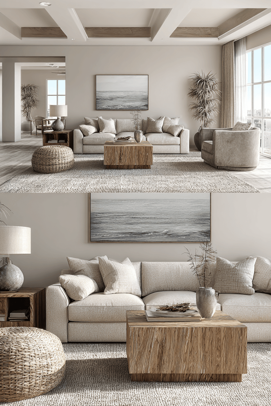 Earthy neutral combinations create a grounded and calming beach house living room. Gray-beige tones paired with wood bring natural balance. Minimal styling keeps everything feeling open. The palette complements outdoor views beautifully. It feels timeless and understated. Bring this calm energy into your beach house living room.