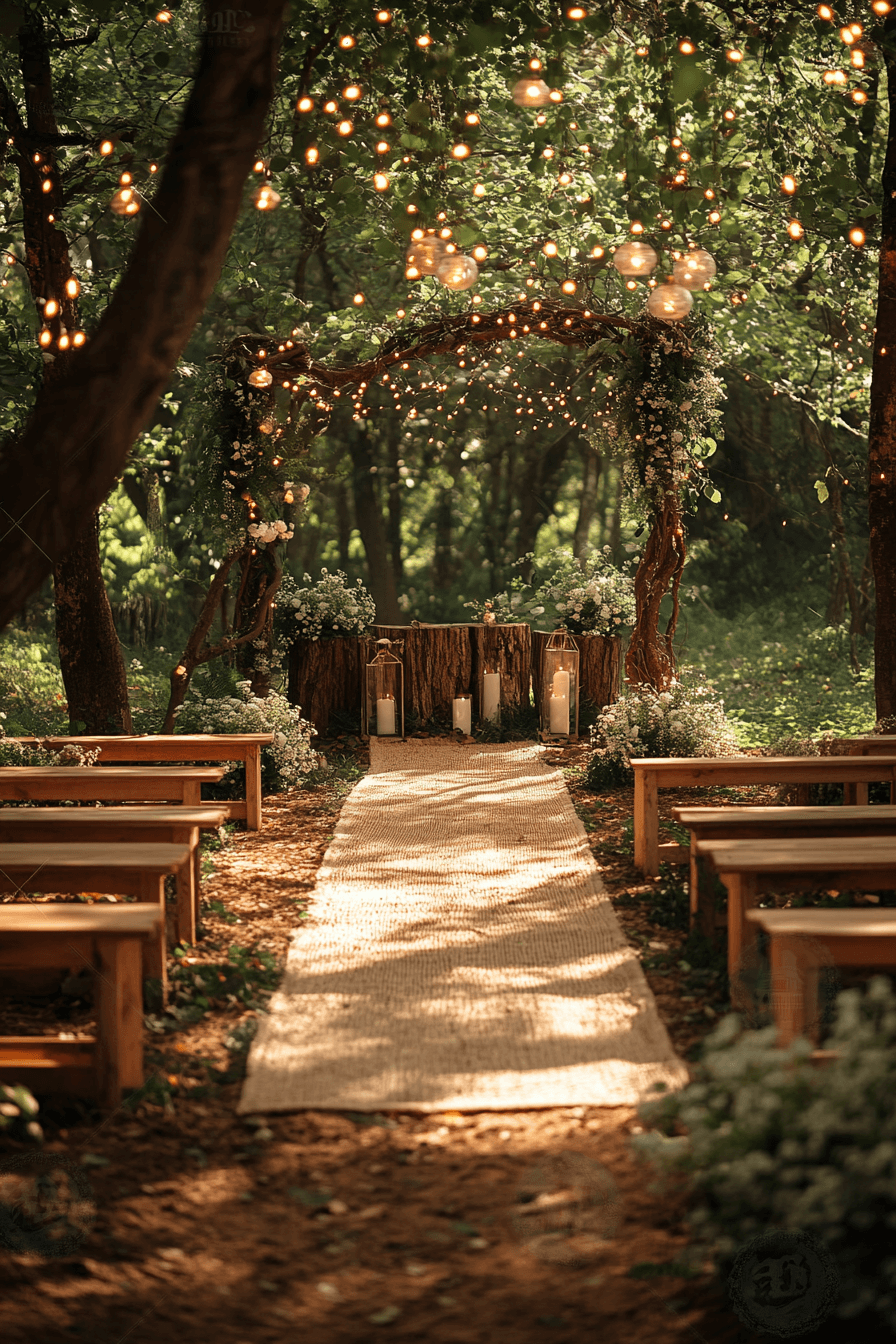 Create a woodland dreamscape with twinkling fairy lights and abundant greenery. Wooden accents bring warmth to the ethereal setting. The ambiance feels enchanting and secluded. Perfect for couples who love nature’s magic.