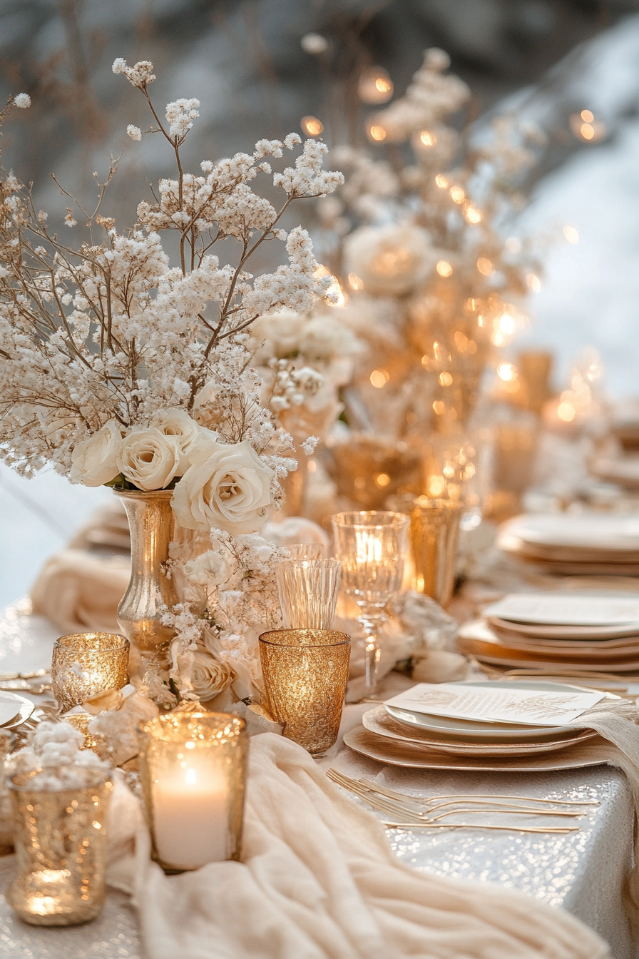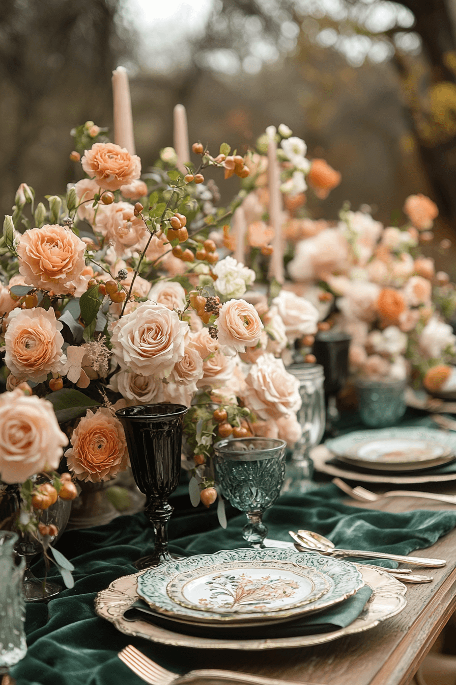 Add depth and elegance with plush velvet in jewel-toned shades. Candlelight reflects off the luxurious textures. The style is cozy yet opulent. Perfect for autumn or winter weddings.