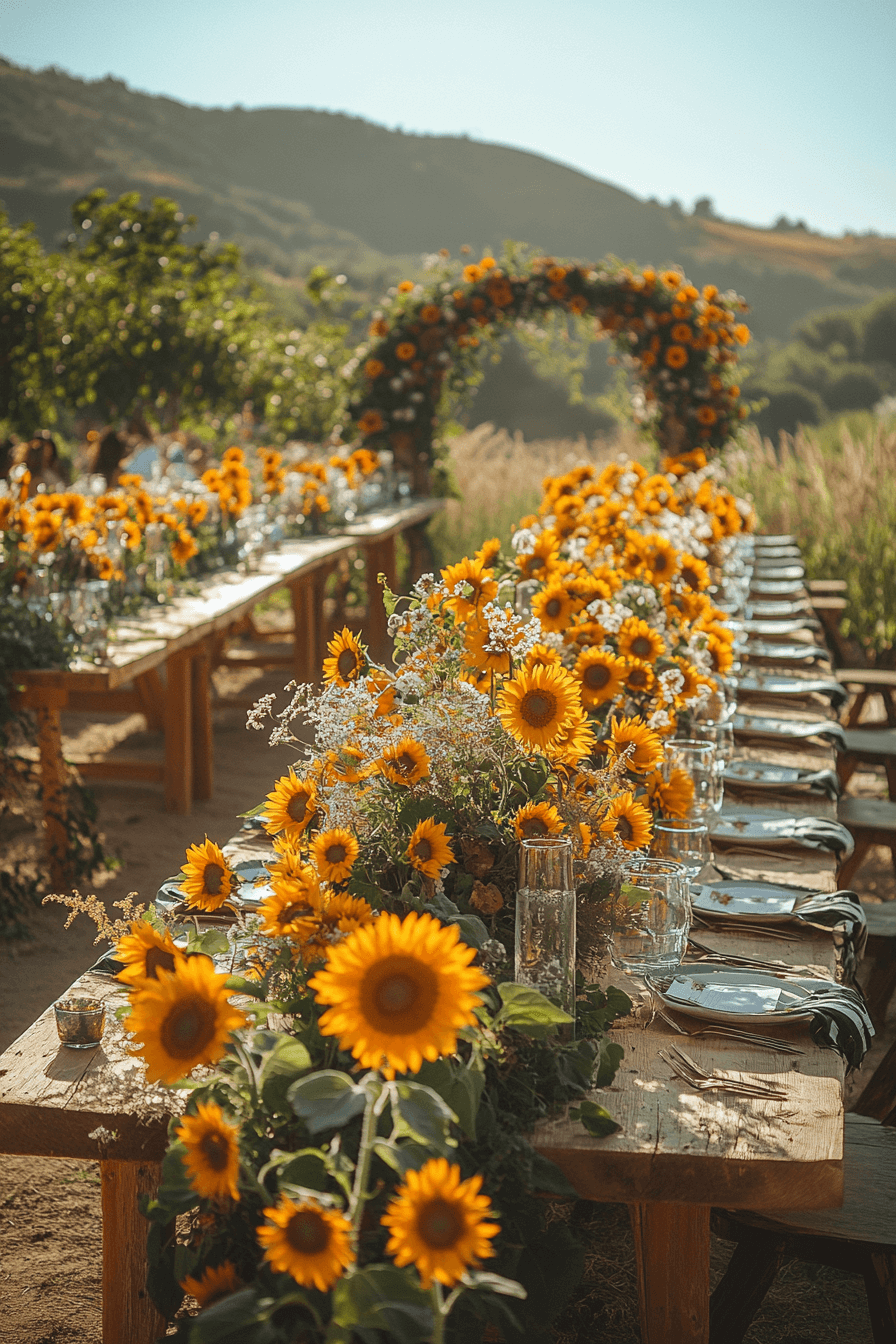 Fill your day with the cheerful charm of golden sunflowers. Wooden barrels and burlap accents make the colors shine. The mood is warm, bright, and inviting. Perfect for outdoor summer weddings.