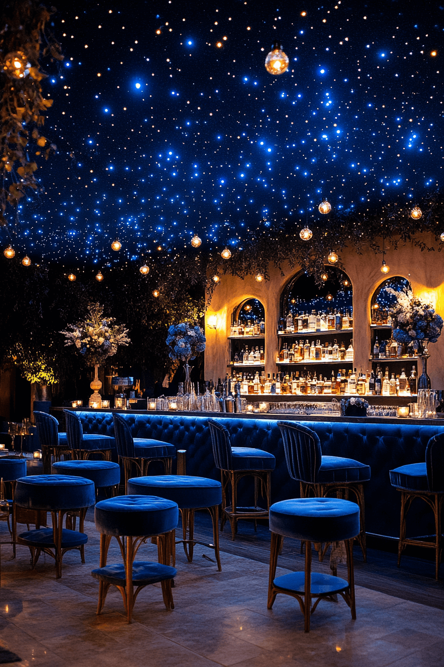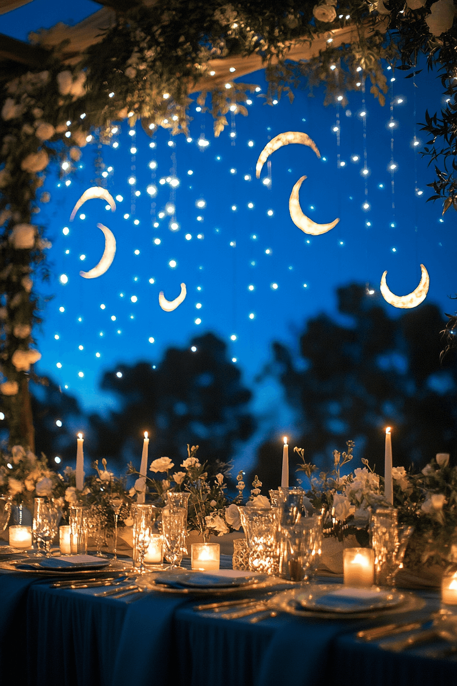 Dance under a night sky filled with celestial decor. Moon phases, stars, and deep blue tones create a dreamy backdrop. The atmosphere feels magical and infinite. Perfect for stargazing romantics.