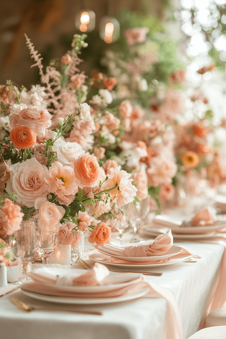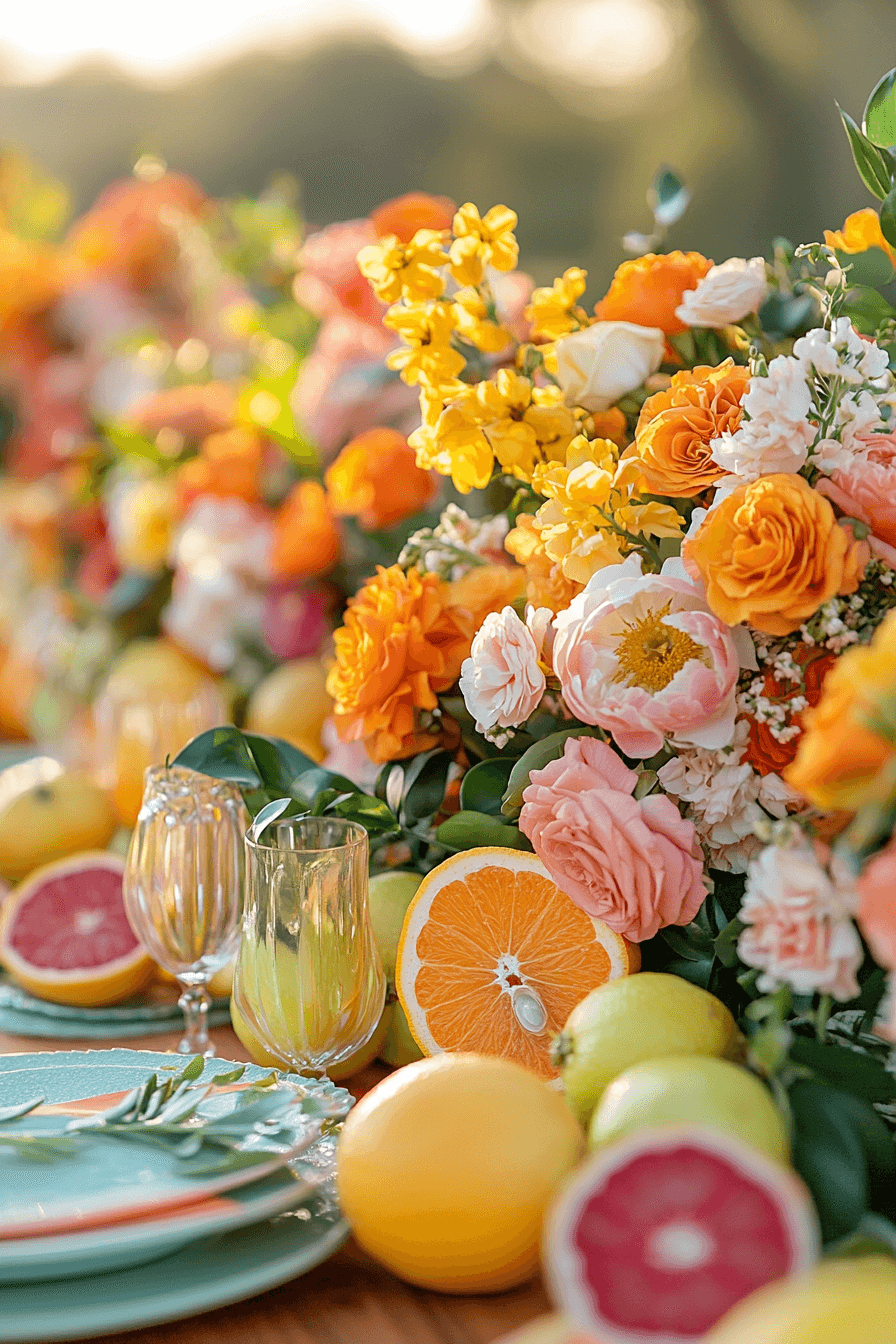 Brighten your setting with zesty citrus tones. Fresh greenery balances the bold shades. The atmosphere feels light, joyful, and summery. Perfect for warm-weather weddings.