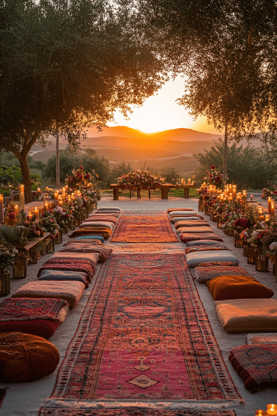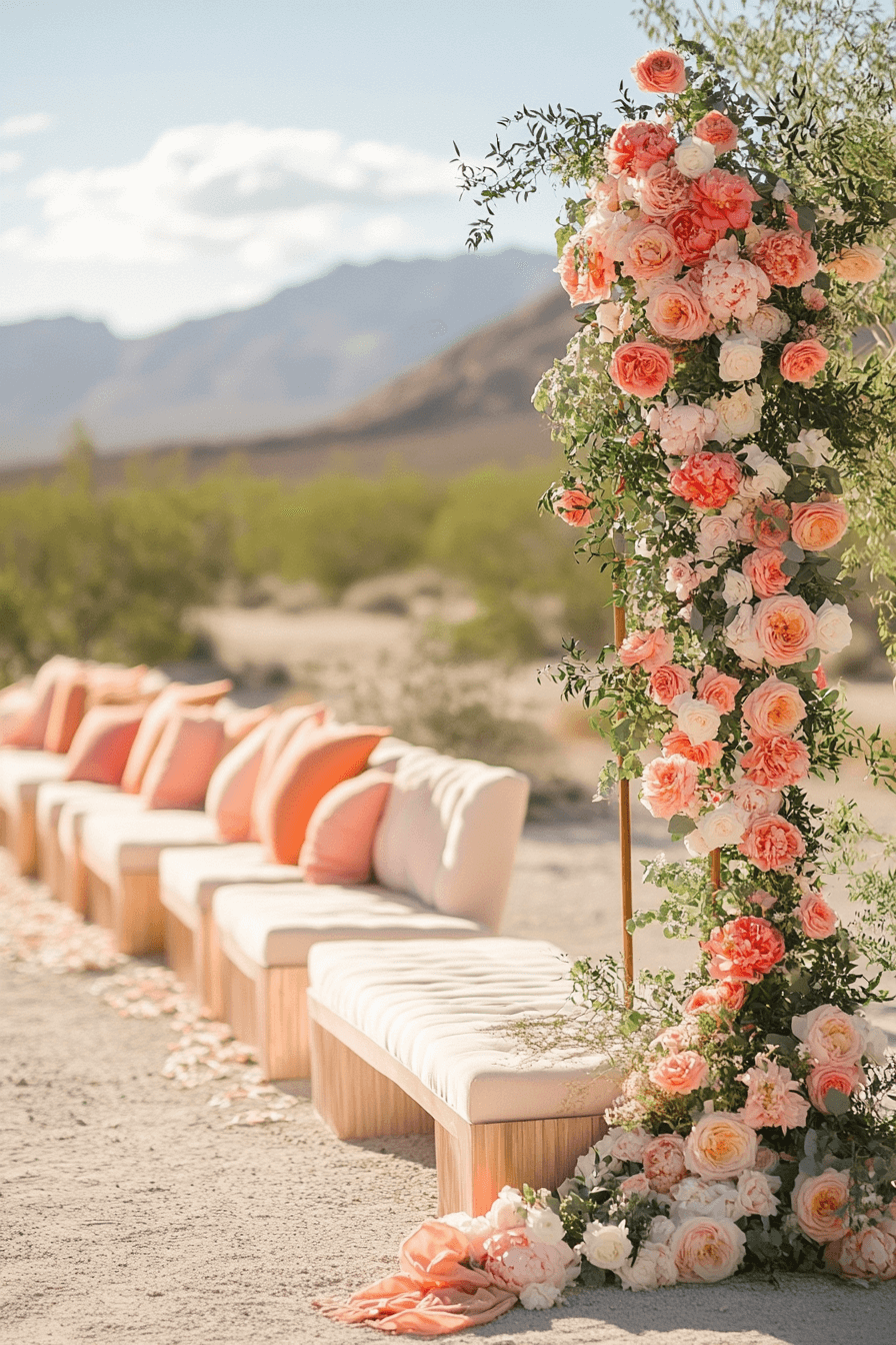 Let warm sunset hues wash over your ceremony, blending coral, blush, and deep orange in perfect harmony. Twinkling lights add magic as the evening sets in. The atmosphere feels both cozy and celebratory. Ideal for a golden-hour “I do.”