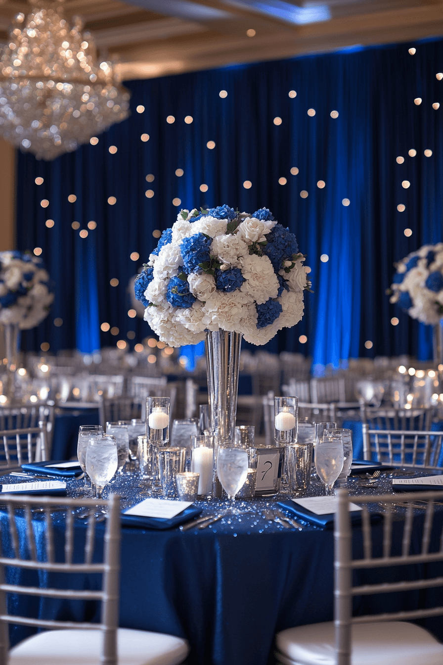 Choose deep sapphire blues paired with shimmering accents for a regal touch. Soft lighting keeps the look intimate. The combination feels elegant and timeless. Perfect for evening vows.
