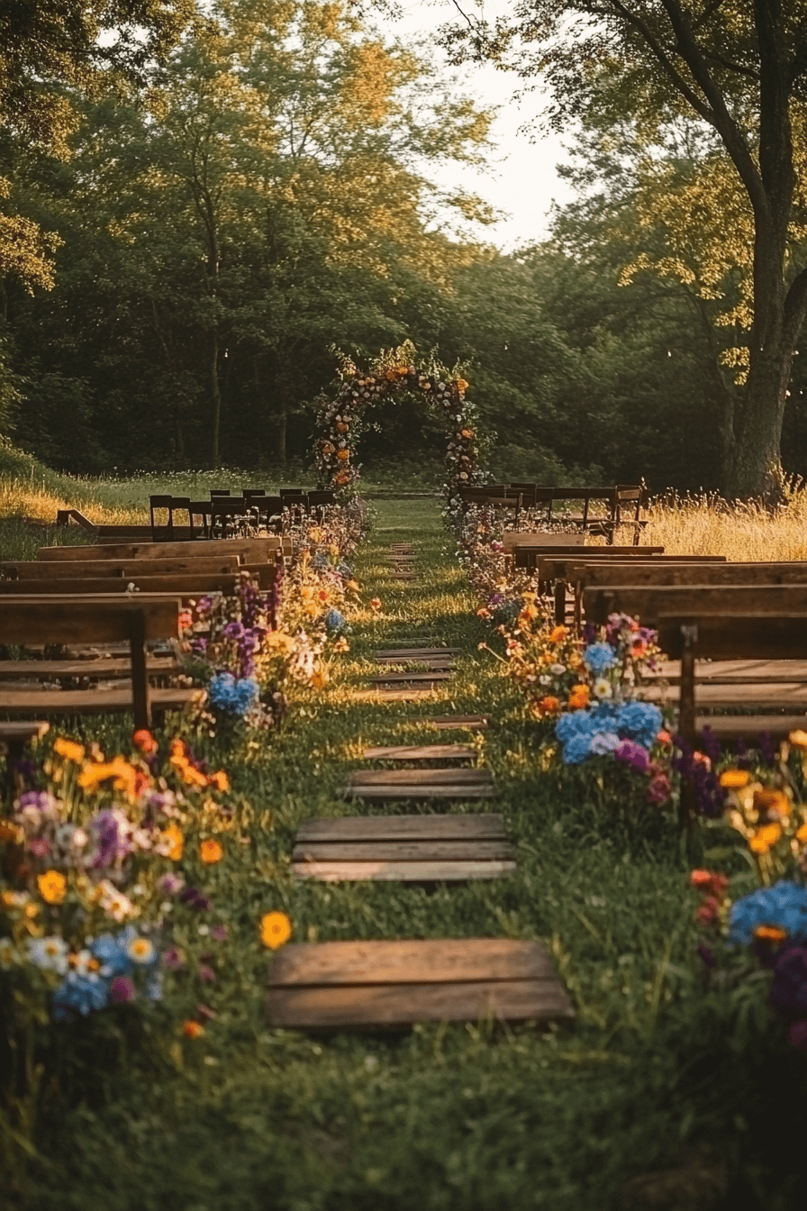 Fill your space with abundant blooms in every hue. Wooden accents keep the look grounded and natural. The energy is vibrant yet relaxed. Perfect for garden celebrations.