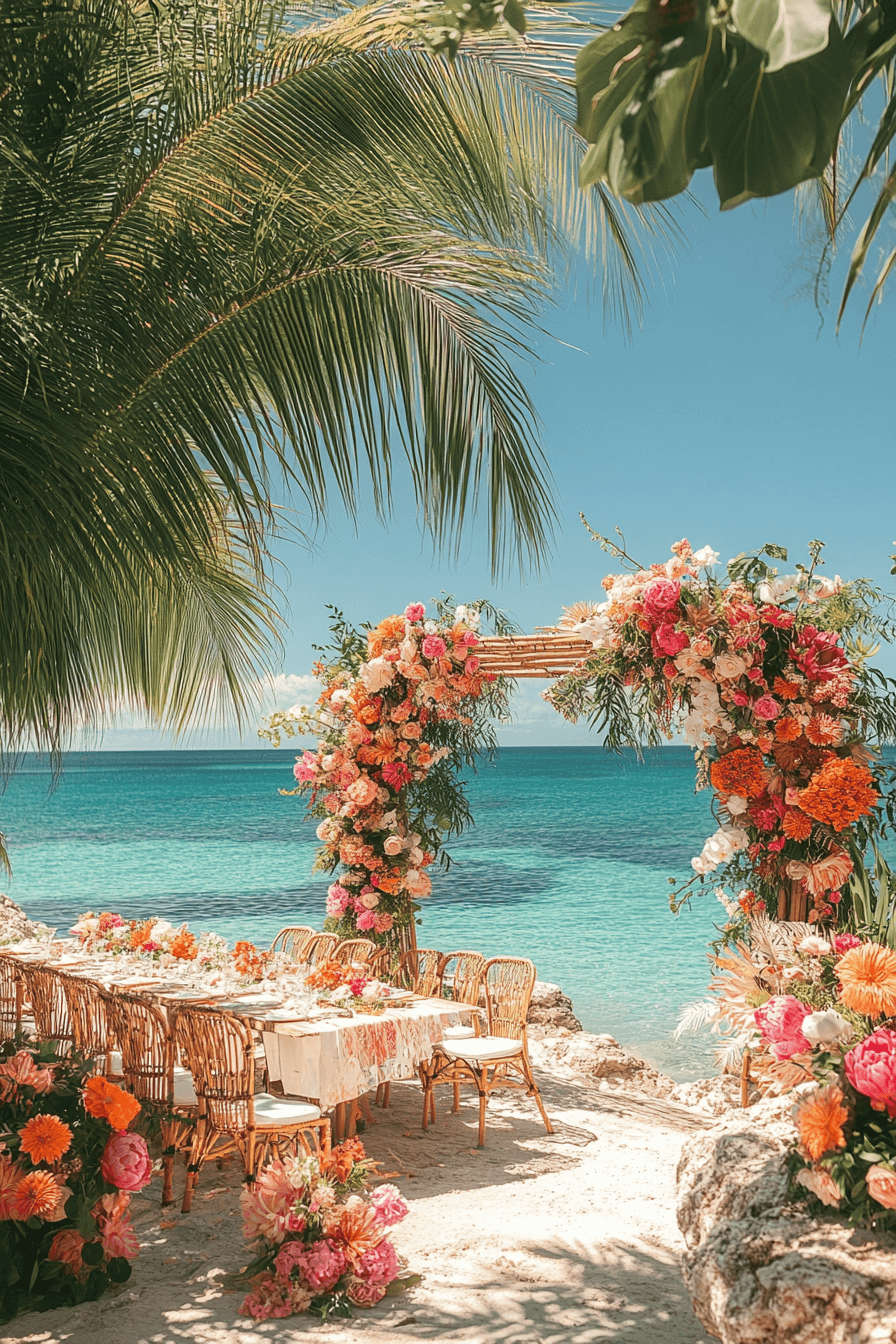 Transport your guests to a lush tropical paradise with vibrant greens and exotic flowers. Woven details and bamboo accents add warmth and texture. The celebration feels alive with color and joy. Perfect for a summer beach destination.