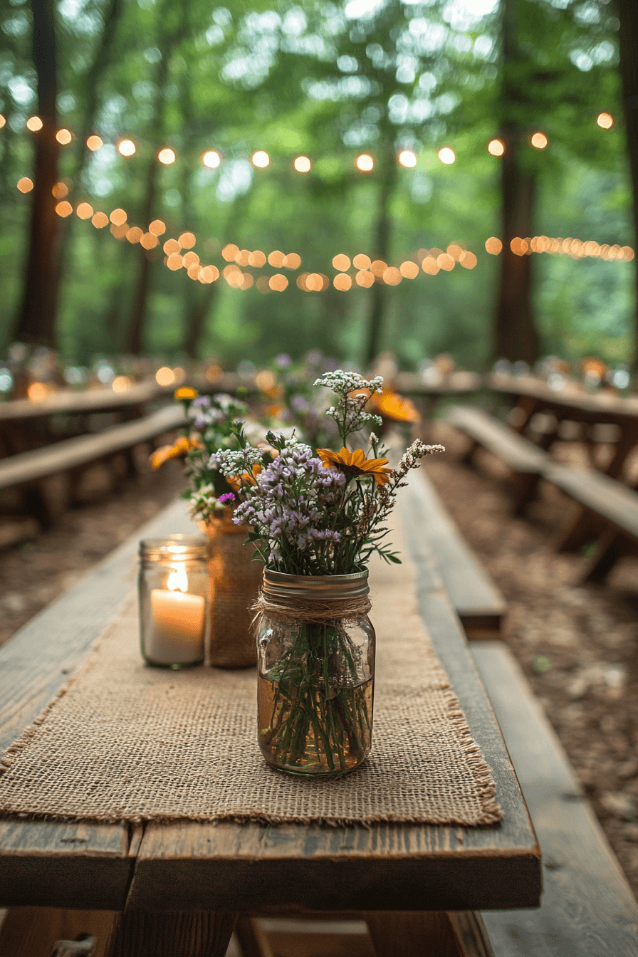 Blend handmade decor with rustic charm for an intimate, cozy setting. String lights cast a warm glow over wooden tables and natural greenery. The atmosphere feels personal and heartfelt. Perfect for smaller celebrations.