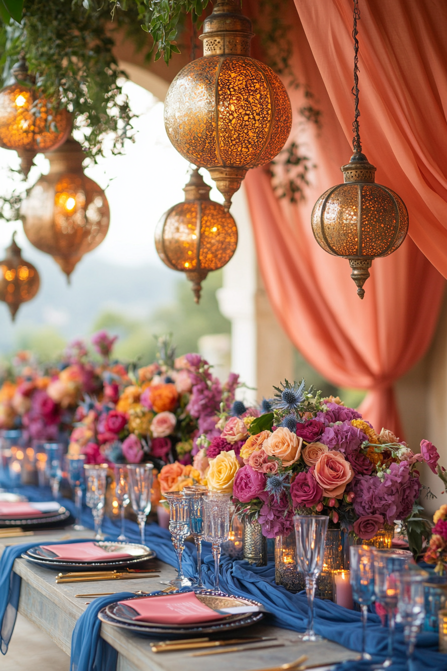 Fill your venue with Moroccan-inspired jewel tones and golden lanterns. Luxurious fabrics drape effortlessly across tables and arches. The look is bold, exotic, and deeply romantic. Perfect for a culturally rich celebration.