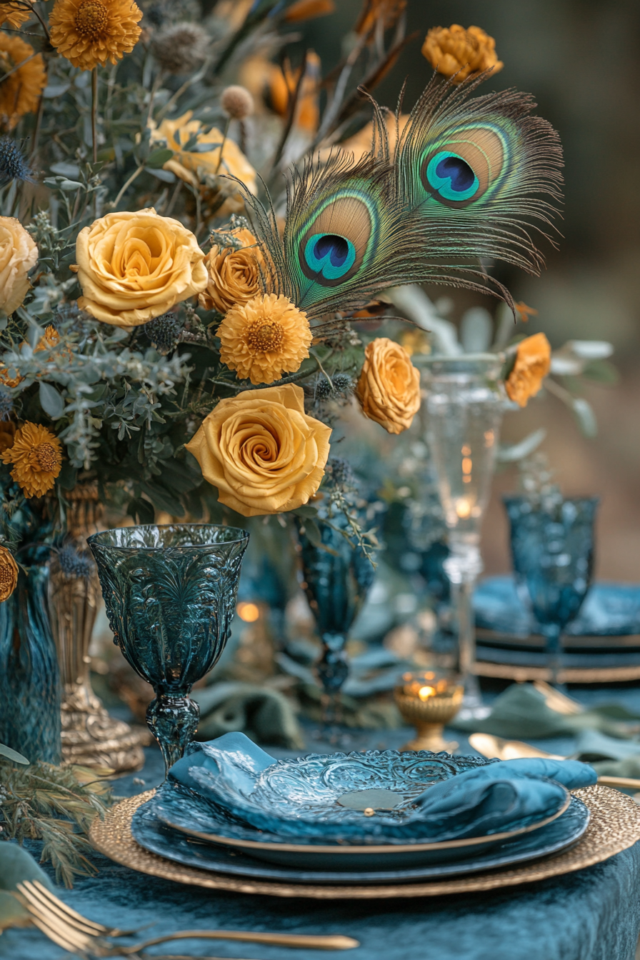 Bring in the jewel tones of peacock feathers for a striking palette. Gold accents add just the right touch of luxury. The colors are bold yet harmonious. Perfect for statement-making couples.