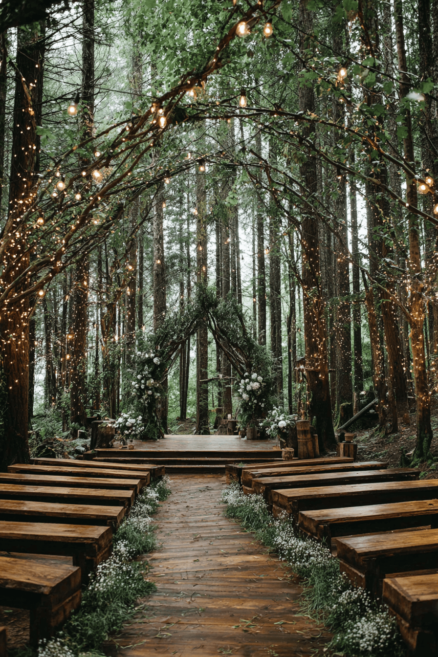 Towering trees and glowing lights create an enchanting atmosphere for a boho wedding deep in the forest. Wooden benches keep the ceremony layout simple and grounded. A greenery-covered arch blends into the surroundings beautifully. Fairy lights add a magical glow overhead. The entire scene feels dreamy yet intentional. Bring this forest-inspired boho wedding to life and create a fairytale moment.