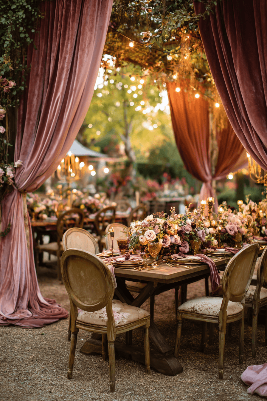 Velvet textures and antique details bring timeless elegance into a boho wedding with vintage charm. Rich fabrics drape beautifully across the space, adding depth and warmth. Carefully arranged tables feature classic decor that feels curated and unique. Soft lighting enhances the romantic atmosphere. The overall design feels cozy yet elevated. Create your own vintage-inspired boho wedding and embrace the romance.