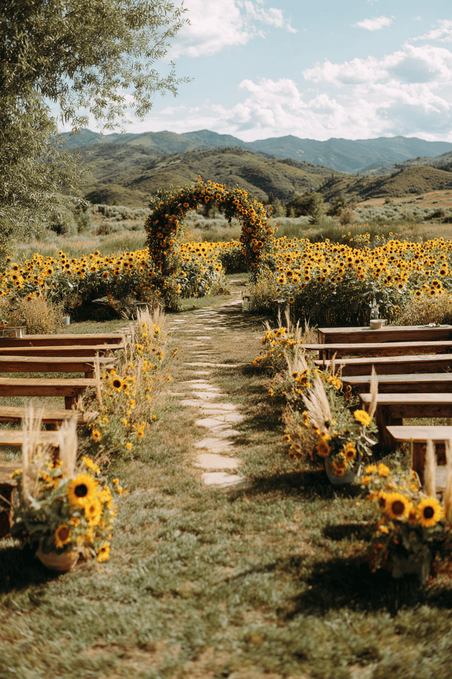 Bright sunflower blooms fill this boho wedding with warmth, happiness, and natural beauty. A floral arch bursting with yellow tones anchors the ceremony. Wooden tables are styled simply to let the flowers shine. Sunlight enhances the golden palette throughout the space. The entire setting feels joyful and inviting. Bring this cheerful boho wedding vision to life and celebrate in sunshine.