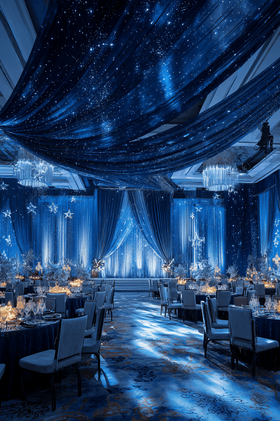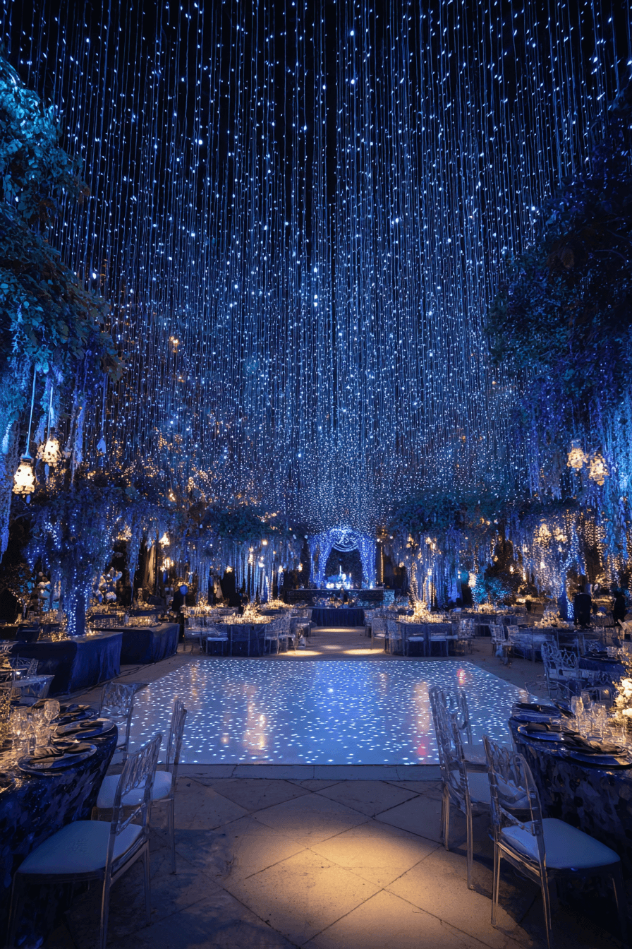 Deep sapphire tones elevate a boho wedding with a bold and refined atmosphere. Silver accents add contrast and shine. A starry backdrop enhances the ceremony space beautifully. Tables are styled with cohesive, elegant details. The mood feels polished yet romantic. Create your dream sapphire-inspired boho wedding.