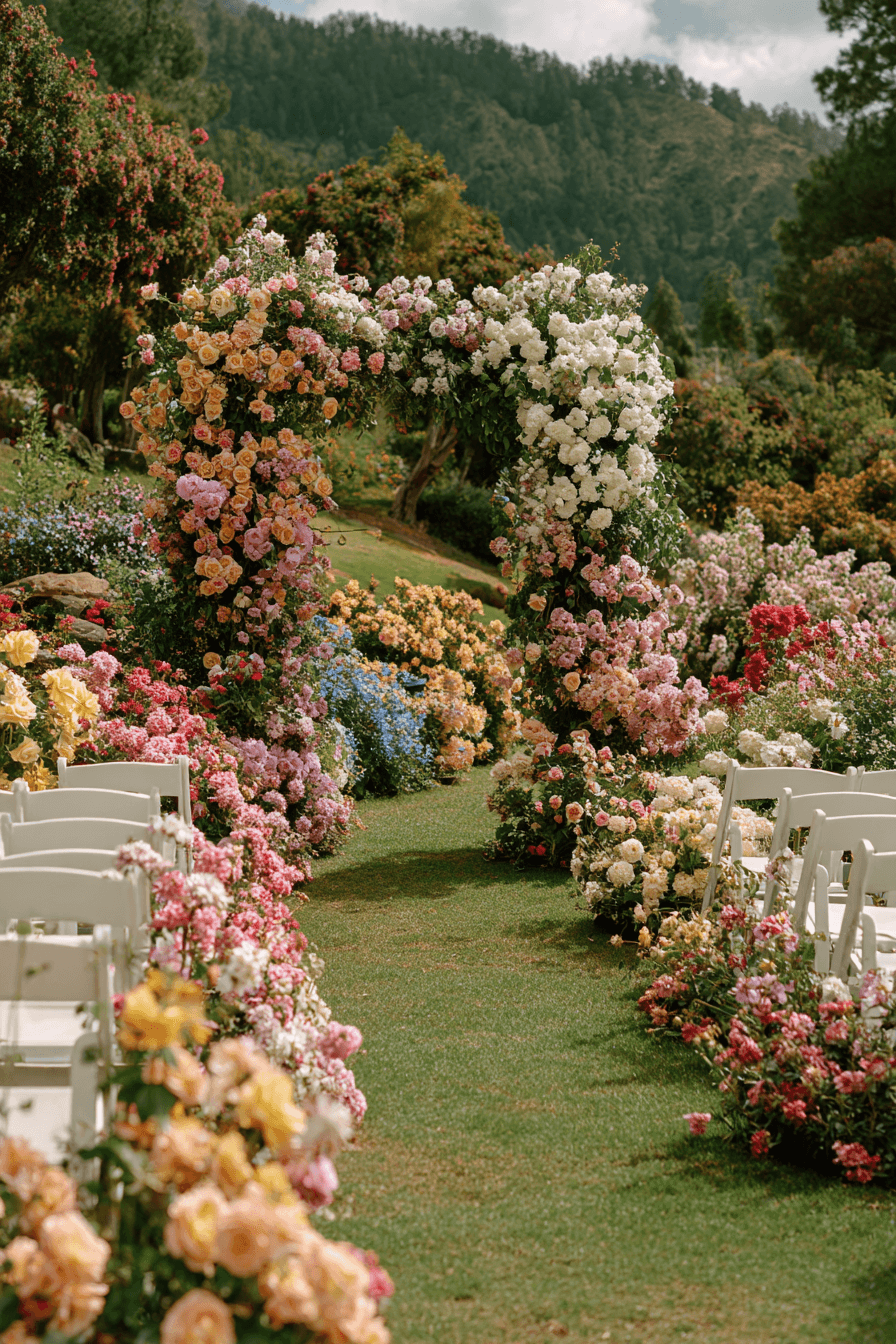Fresh blooms and vibrant colors define a boho wedding set in a lush garden setting. A floral arch becomes the focal point of the ceremony. Neatly arranged seating keeps the layout clean and inviting. Reception tables feature playful patterns and bright centerpieces. The space feels lively yet well-balanced. Turn this garden boho wedding into your dream celebration.