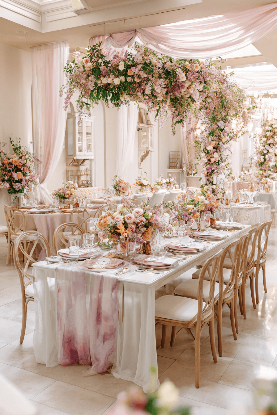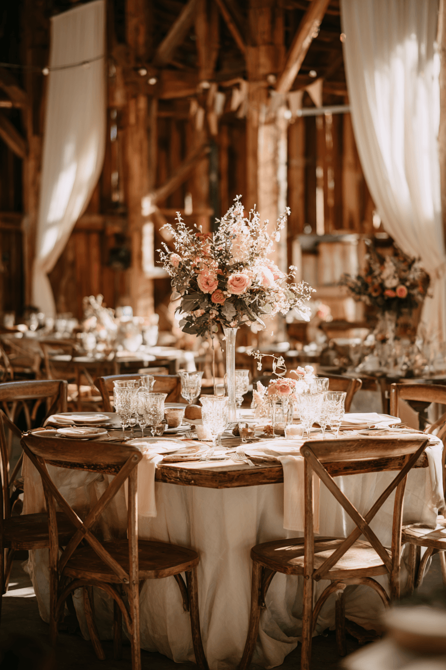 Soft pastel hues add charm and warmth to a boho wedding set inside a rustic barn. Gentle colors blend beautifully with natural wood textures. Draped fabrics and lighting create a cozy glow. Tables are styled simply for a balanced look. The space feels intimate and inviting. Design your boho wedding with this soft and charming style.