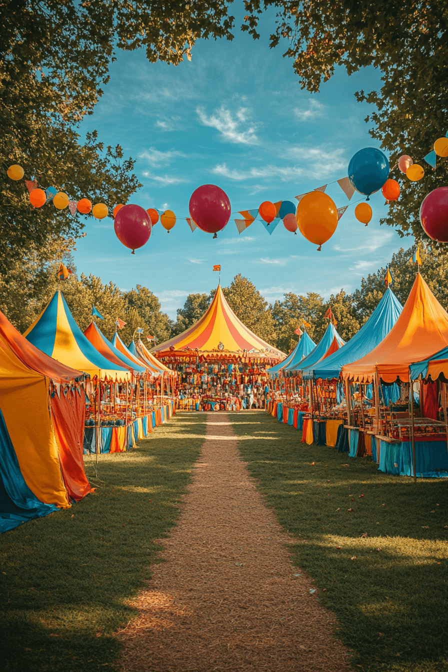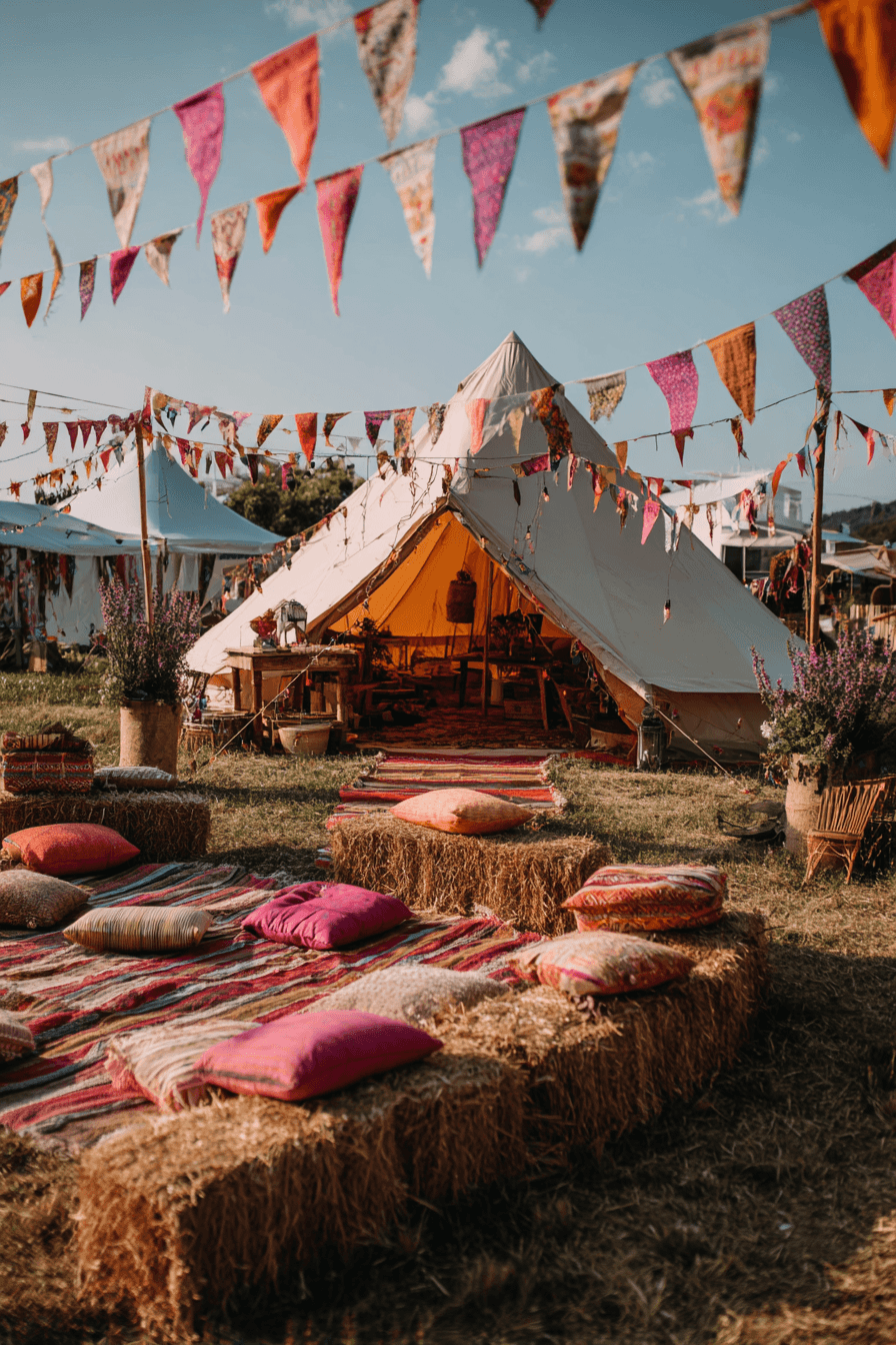 Bright tents and lively details turn this boho wedding into a vibrant festival-style celebration. A central stage anchors the layout beautifully. Relaxed seating areas keep guests comfortable and engaged. Food and activity spaces add fun without chaos. The atmosphere feels energetic and joyful. Bring this festival boho wedding vision to life.