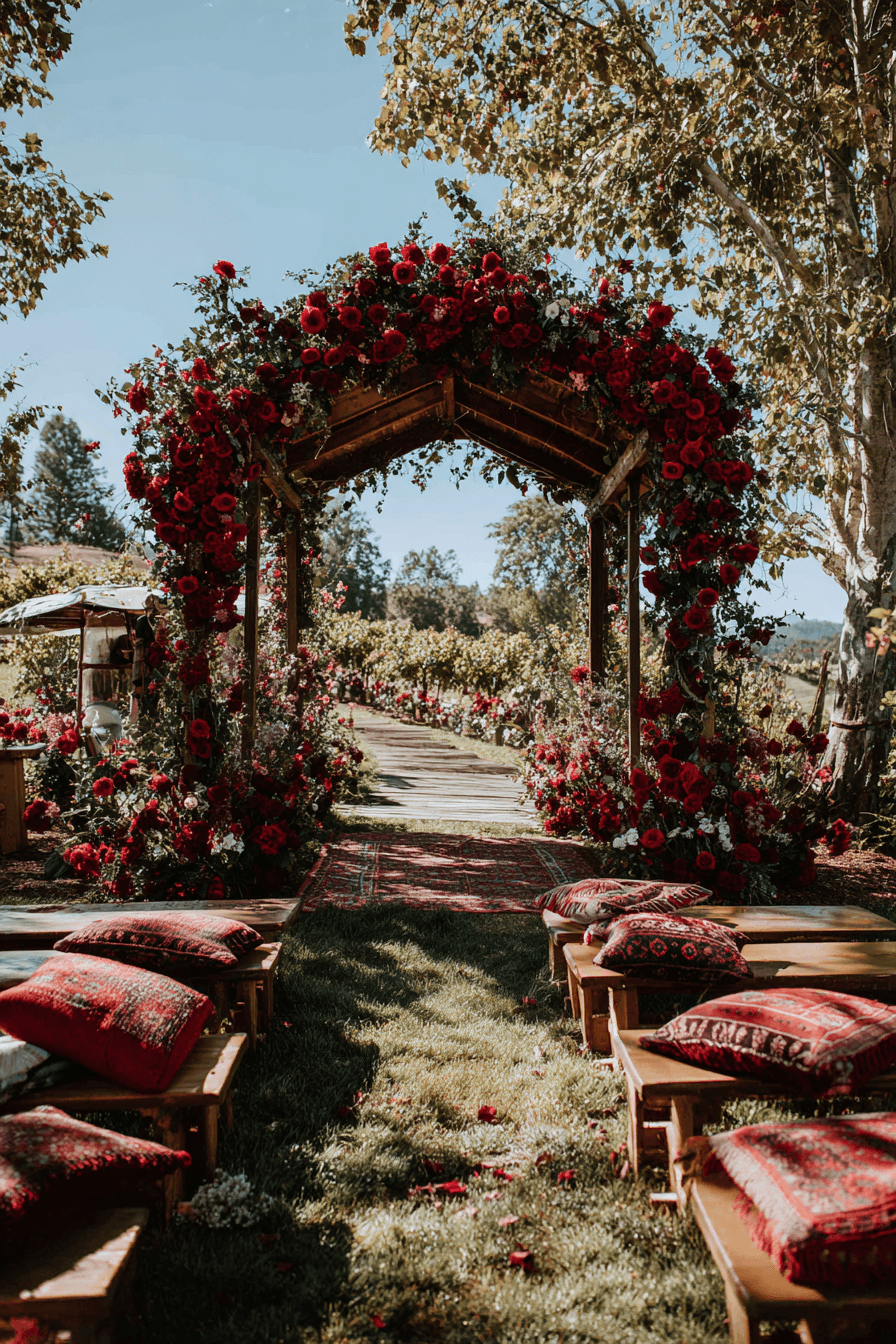 Rich crimson tones create a romantic boho wedding set within a beautiful vineyard. A bold floral arch anchors the ceremony space. Handmade details add meaning and personality. The layout flows seamlessly into the reception. Natural textures enhance the warmth of the design. Plan your heartfelt boho wedding with this stunning style.