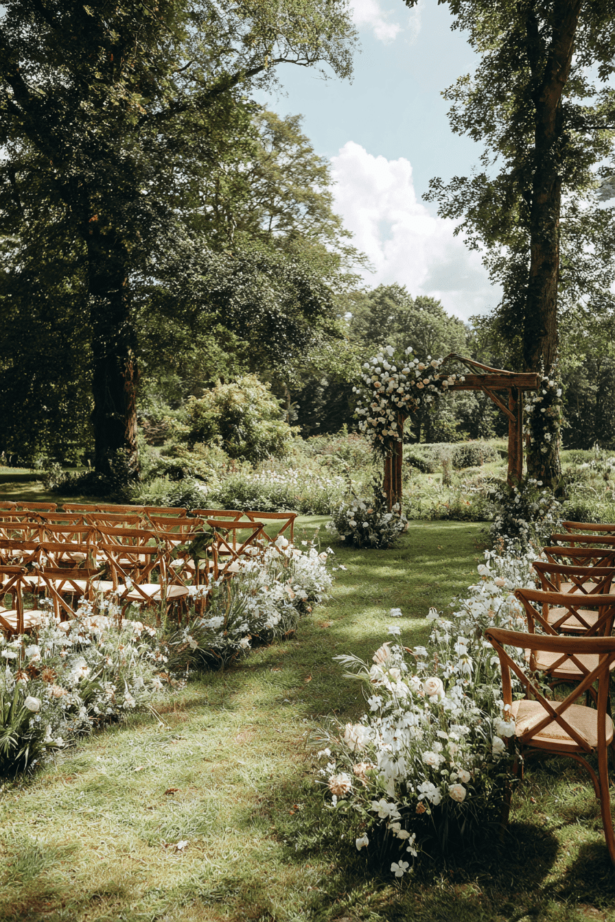 A field of wildflowers creates a dreamy backdrop for a boho wedding that feels effortlessly romantic and full of life. A natural aisle lined with soft florals guides guests through a beautifully open setting. The ceremony arch blends seamlessly into the landscape, adding structure without taking away from the view. Light fabrics move gently with the breeze, enhancing the relaxed atmosphere. Every detail feels organic, warm, and perfectly balanced. Step into this meadow-inspired boho wedding and start planning your own outdoor escape.