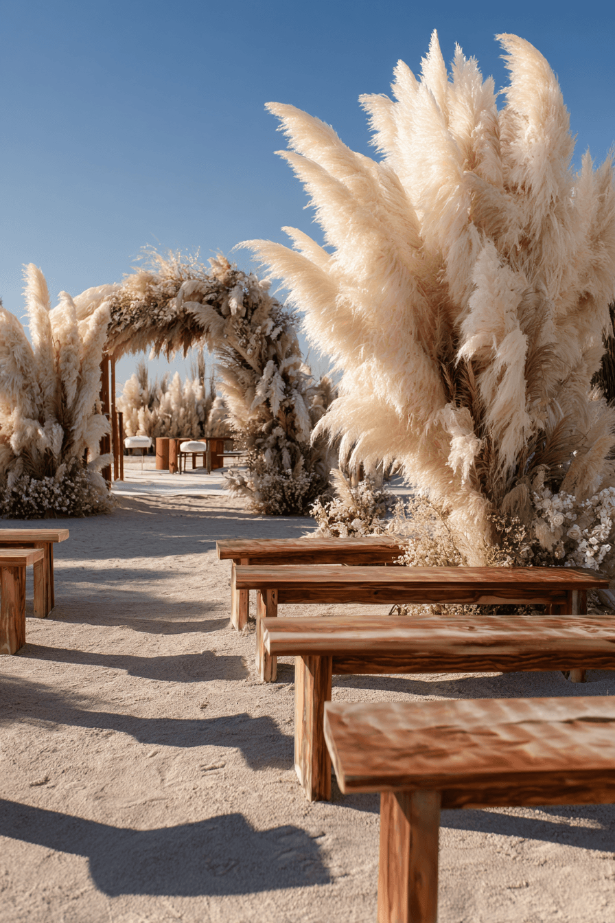 Soft pampas textures define a modern boho wedding filled with neutral tones and elegance. Tall arrangements add height and movement to the space. Clean layouts keep everything looking balanced. The palette feels calm and cohesive. Natural materials add warmth without clutter. Bring this chic boho wedding aesthetic to life.