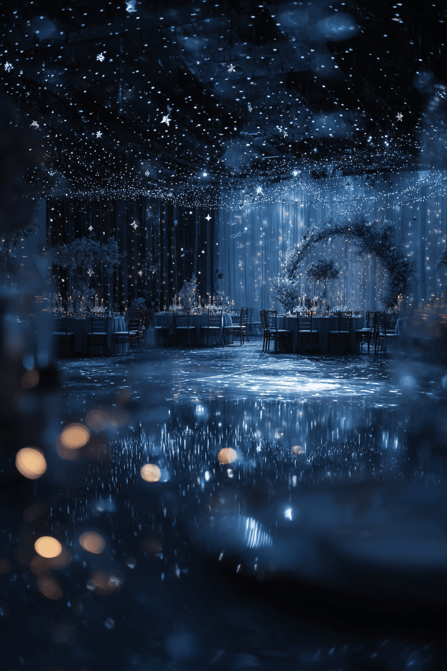A starry night sky sets the scene for a magical boho wedding filled with glowing details and celestial charm. A central dance floor becomes the heart of the celebration. Soft lighting and deep tones create a dreamy atmosphere. Celestial decor adds a unique and playful touch. The space feels immersive and unforgettable. Plan your nighttime boho wedding and let it shine.