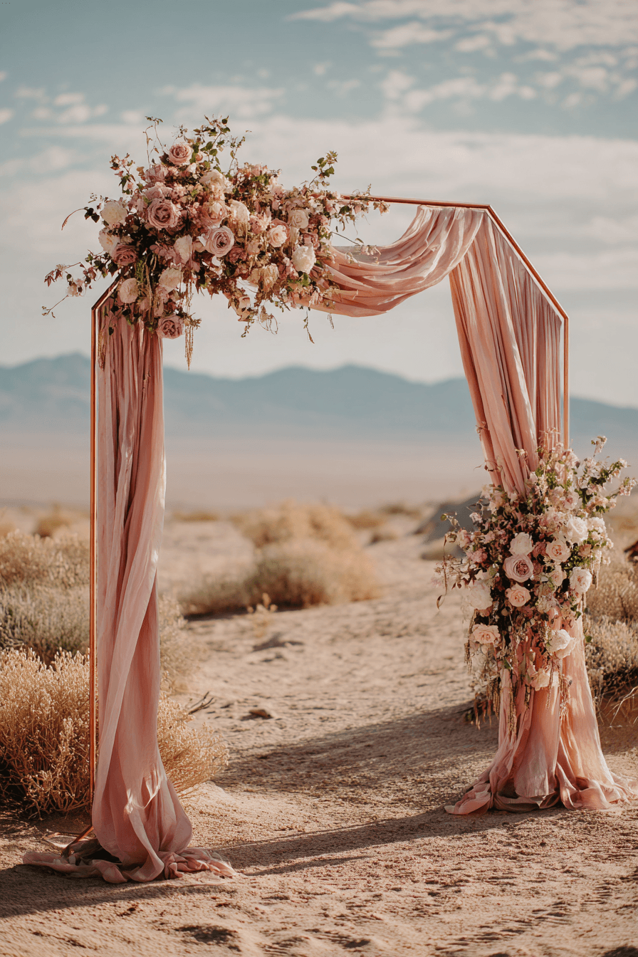 Soft desert tones bring a calm, elevated feel to a boho wedding set against a sunlit landscape. Flowing blush fabrics add movement while complementing the natural surroundings. A geometric arch becomes the focal point, styled with delicate florals. Minimal seating keeps the layout clean and intentional. The entire space feels modern yet deeply romantic. Create your dream desert boho wedding and embrace this effortlessly chic style.