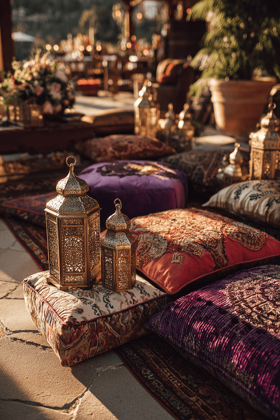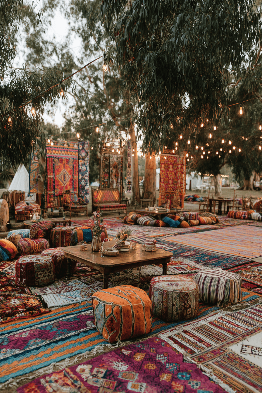 Rich fabrics and intricate details define a boho wedding inspired by Moroccan luxury and texture. Low seating areas filled with plush cushions create a relaxed yet elevated layout. Lanterns cast beautiful patterns of light across the space. Deep jewel tones add warmth and depth to every corner. The entire setting feels immersive and indulgent. Transform your boho wedding with this bold and exotic style.