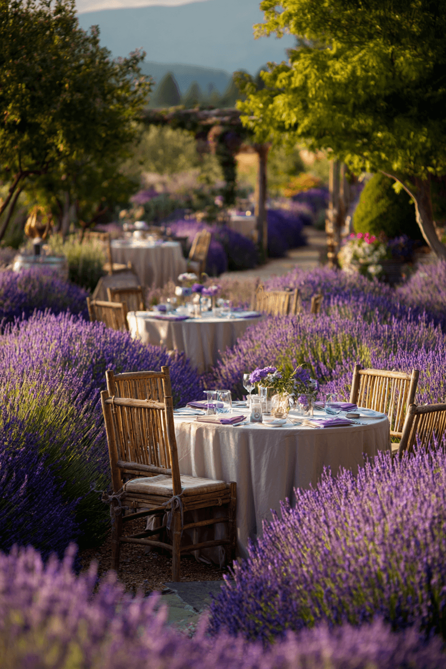 Rows of lavender create a soft and fragrant path for a boho wedding that feels peaceful and enchanting. The natural structure of the field adds effortless elegance to the layout. Rustic tables styled with soft linens keep the design refined yet relaxed. Gentle lighting enhances the calming atmosphere as the day fades. Every element feels harmonious and thoughtfully placed. Let this lavender-filled boho wedding inspire your serene celebration.