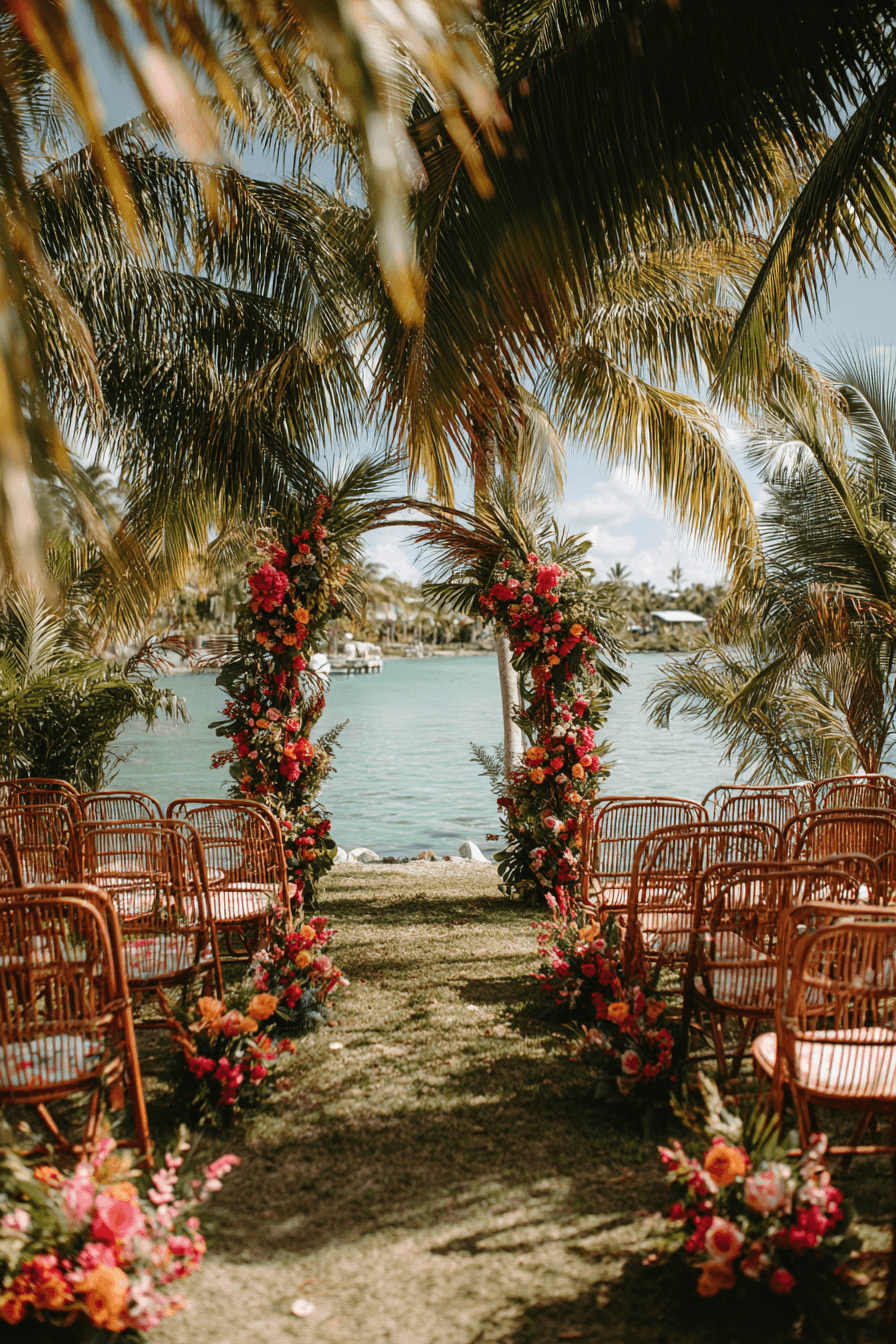 Lush greenery and tropical blooms bring vibrant energy into a boho wedding that feels fresh and full of life. A bamboo arch frames the ceremony beautifully against an open backdrop. Seating is arranged neatly while still maintaining a relaxed feel. Natural materials like rattan and wood add texture and warmth. The overall design feels bright, balanced, and inviting. Bring this tropical boho wedding vision to life and celebrate in style.