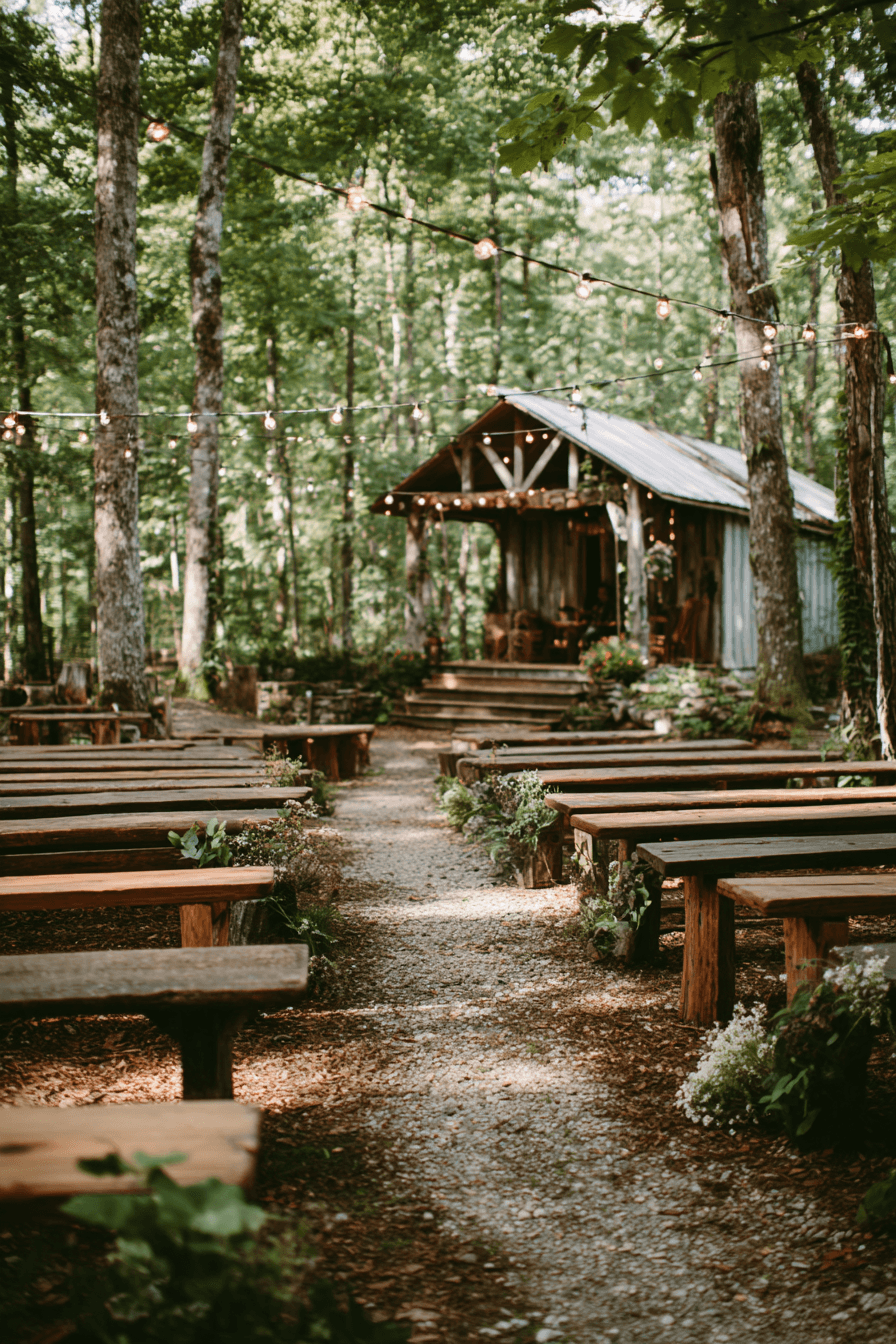 A peaceful forest clearing creates the perfect setting for a boho wedding filled with warmth and charm. Wooden seating lines the aisle, leading to a naturally styled ceremony space. Handmade decor adds a personal, heartfelt touch. String lights create a soft glow as the evening begins. The mix of wood, greenery, and soft fabrics feels cozy and inviting. Plan your woodland boho wedding and make it truly magical.