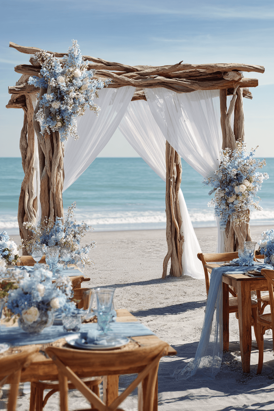 Soft ocean breezes set the tone for a calming boho wedding along the shoreline. A simple arch draped in sheer fabric blends effortlessly into the coastal view. Clean layouts keep the space feeling open and airy. Subtle blue accents reflect the colors of the sea. Natural textures add warmth without overwhelming the design. Create your dream coastal boho wedding and enjoy the peaceful vibe.