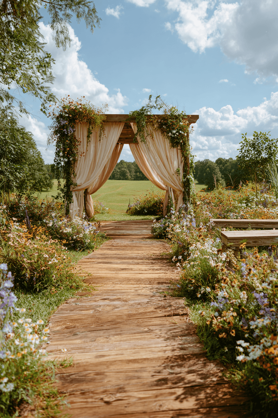Wide open fields create a refreshing backdrop for a boho wedding that feels natural and free. Wooden tables are arranged neatly throughout the space. Wildflowers add soft, effortless color. A simple arch blends into the surroundings. The design feels relaxed and grounded. Create your own meadow-inspired boho wedding escape.