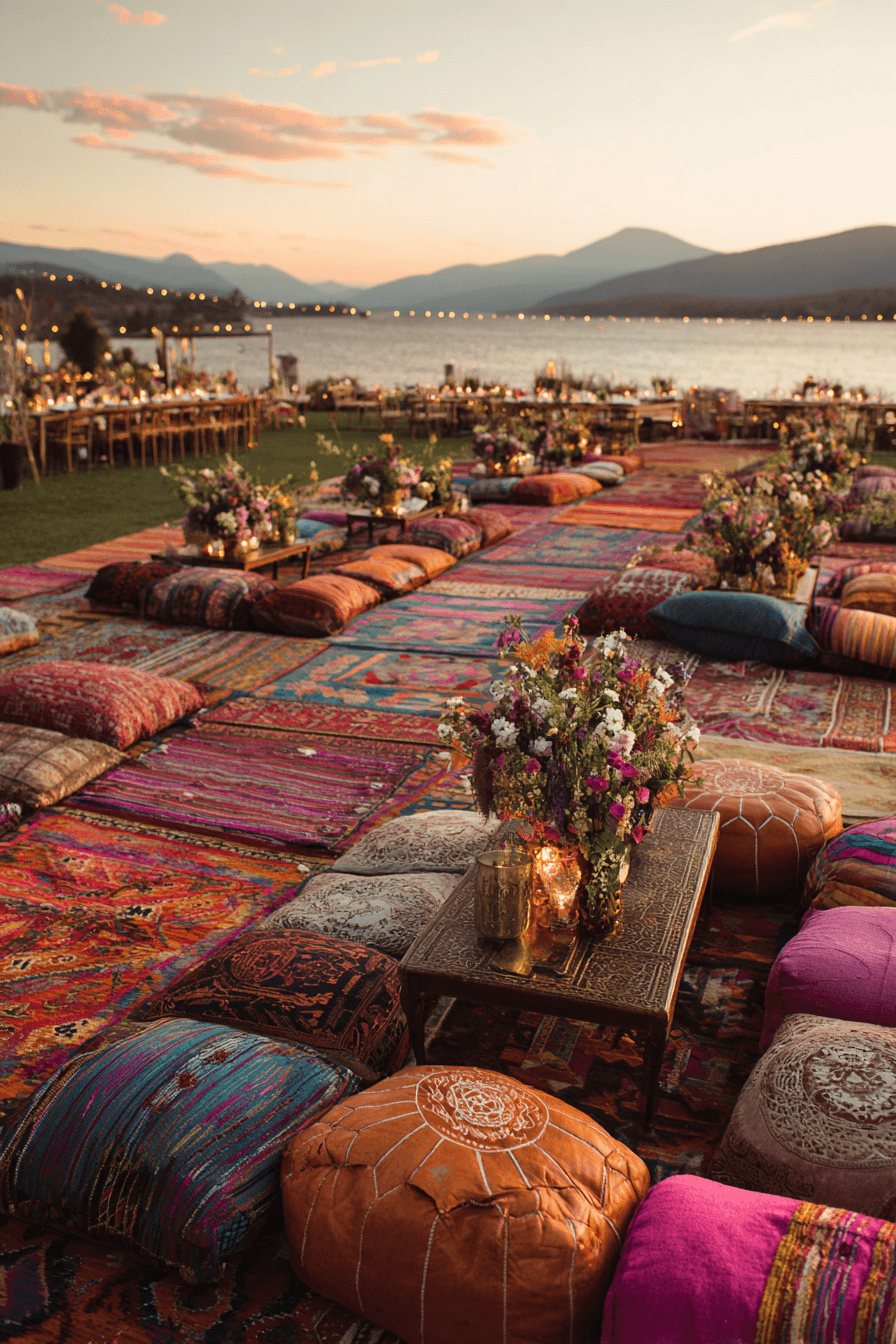 Golden hour transforms the entire setting into a glowing boho wedding filled with warmth and layered textures. Moroccan rugs create a colorful aisle that feels cozy and inviting underfoot. Soft cushions and low seating bring a grounded, intimate vibe to the layout. The sunset sky adds a romantic wash of light across every detail. Rich fabrics and subtle lighting create depth without overwhelming the space. Let this sunset-inspired boho wedding guide your perfect evening celebration.