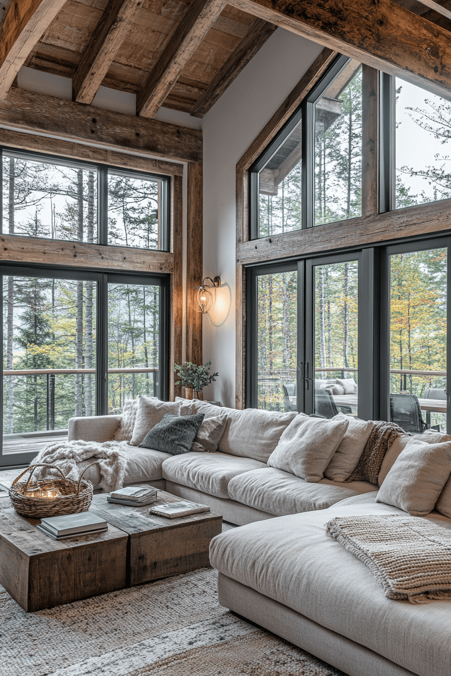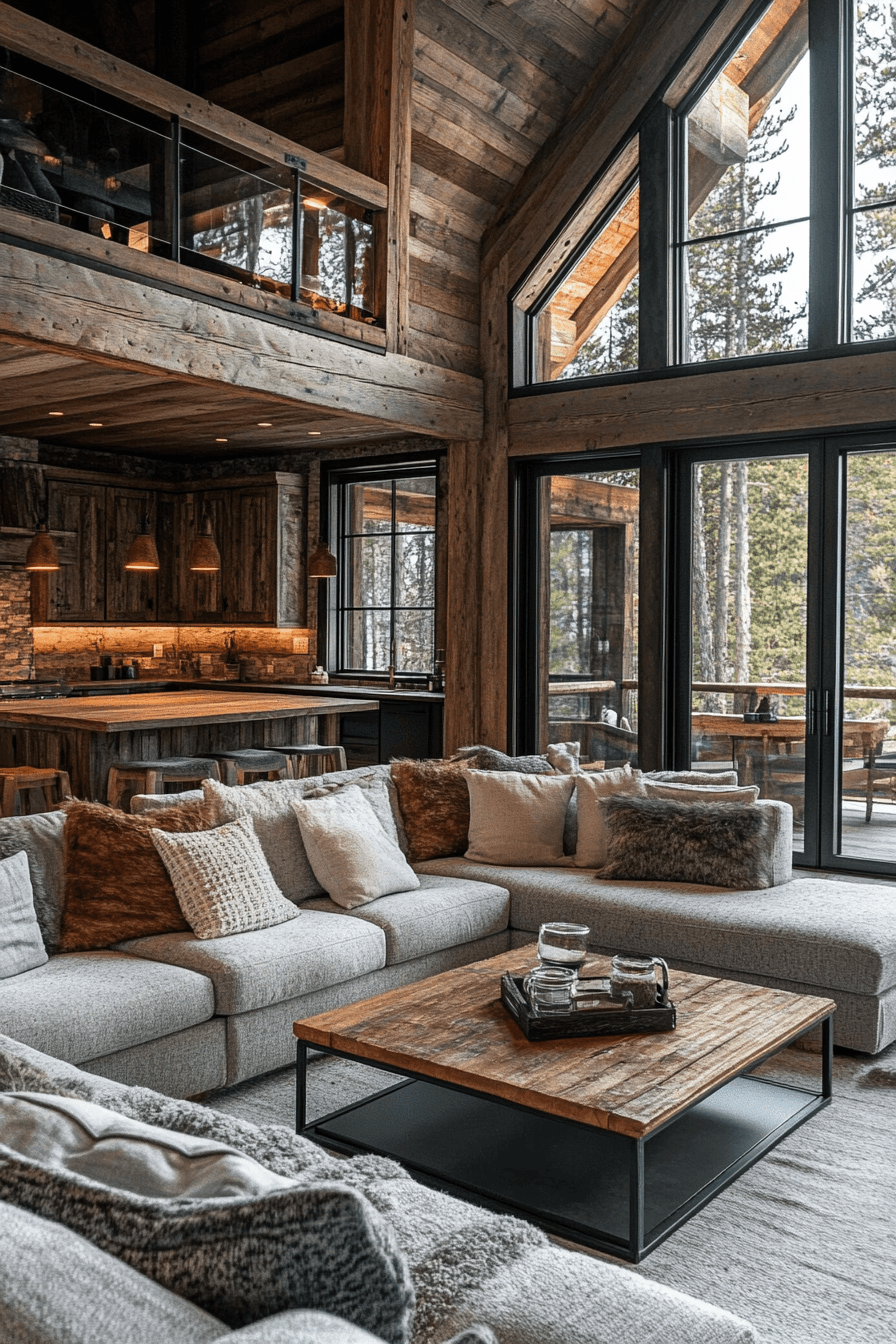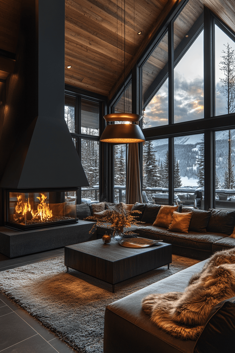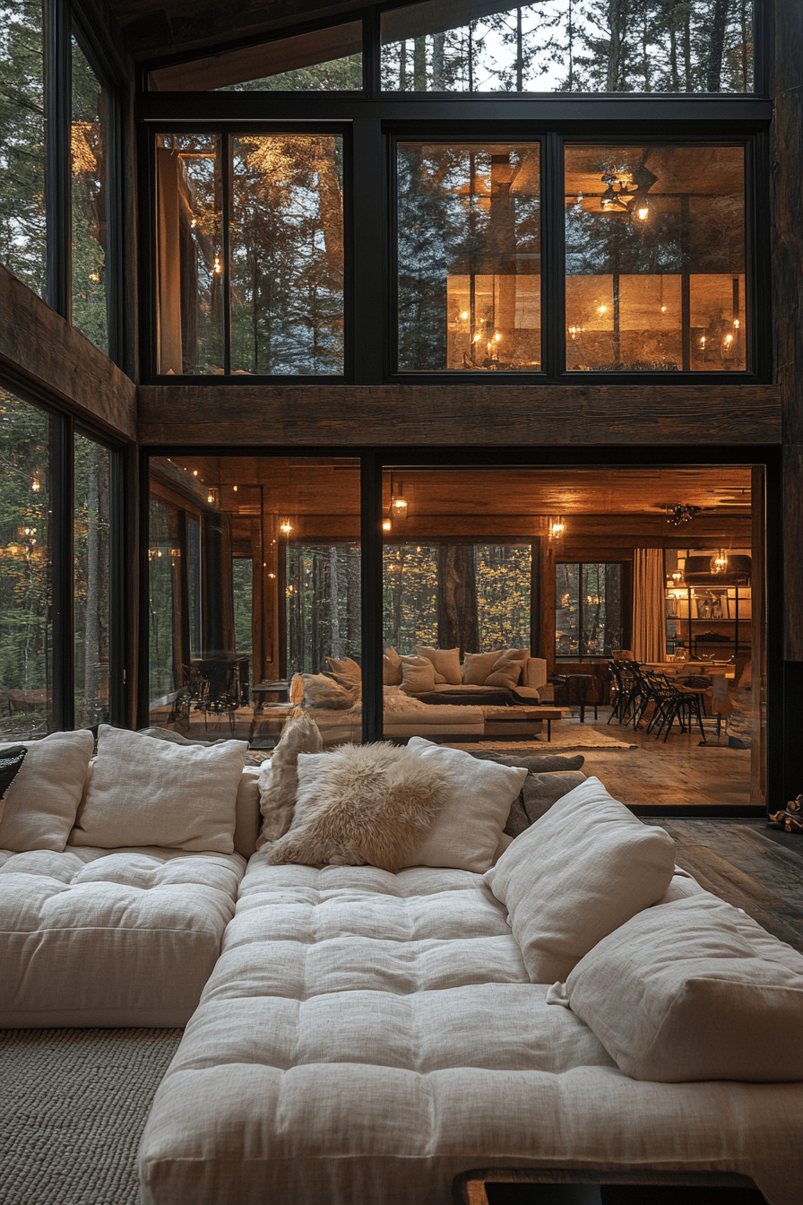 Floor-to-ceiling windows transform cabin interiors into light-filled retreats that feel connected to the outdoors. Clean lines and modern furnishings keep the layout simple and uncluttered. Natural scenery becomes part of the decor, creating a seamless visual flow. The contrast between sleek interiors and rugged surroundings feels striking and fresh. Every detail enhances both comfort and style. Refresh your cabin interiors with this modern mountain approach.
