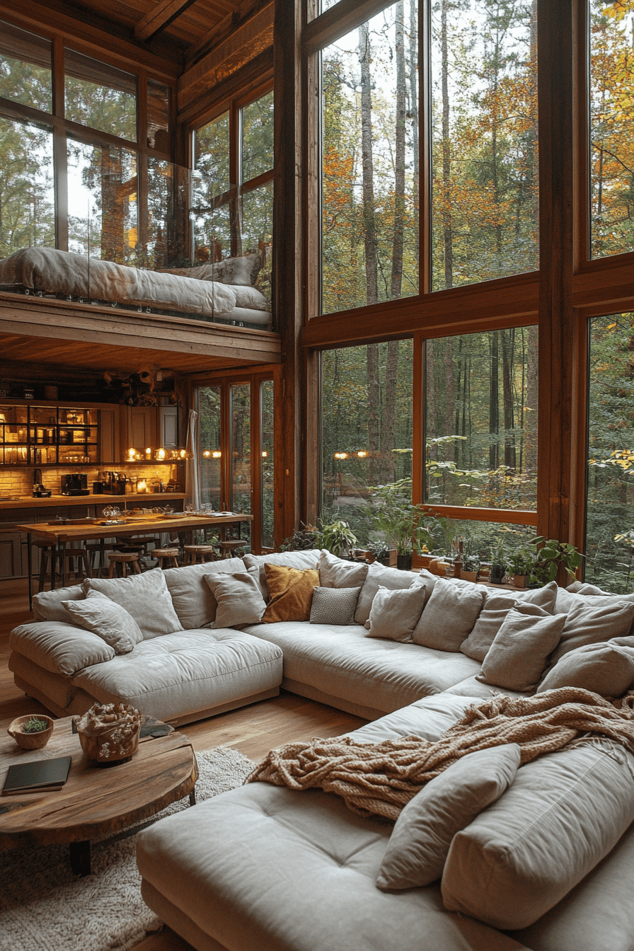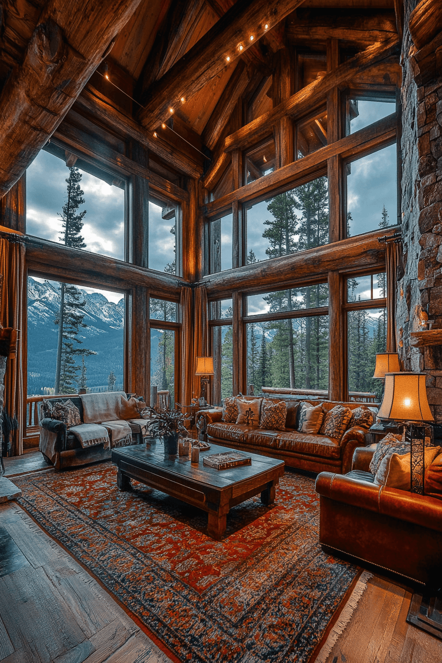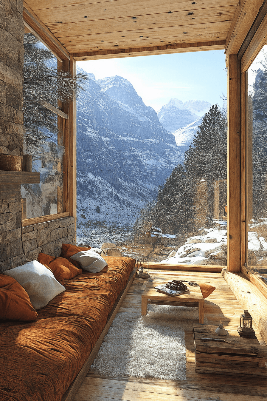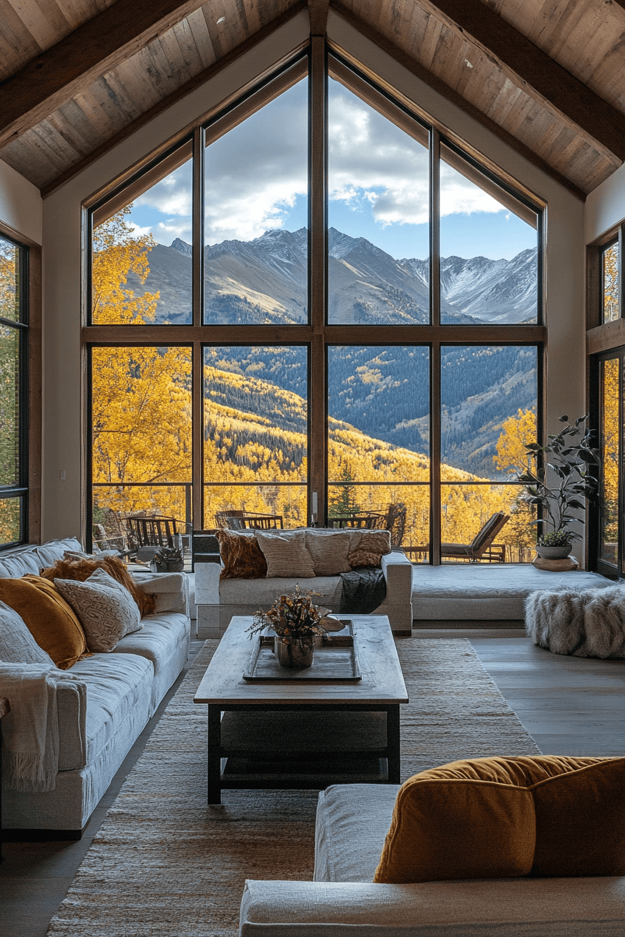 Floor-to-ceiling windows transform cabin interiors into light-filled retreats that feel connected to the outdoors. Clean lines and modern furnishings keep the layout simple and uncluttered. Natural scenery becomes part of the decor, creating a seamless visual flow. The contrast between sleek interiors and rugged surroundings feels striking and fresh. Every detail enhances both comfort and style. Refresh your cabin interiors with this modern mountain approach.