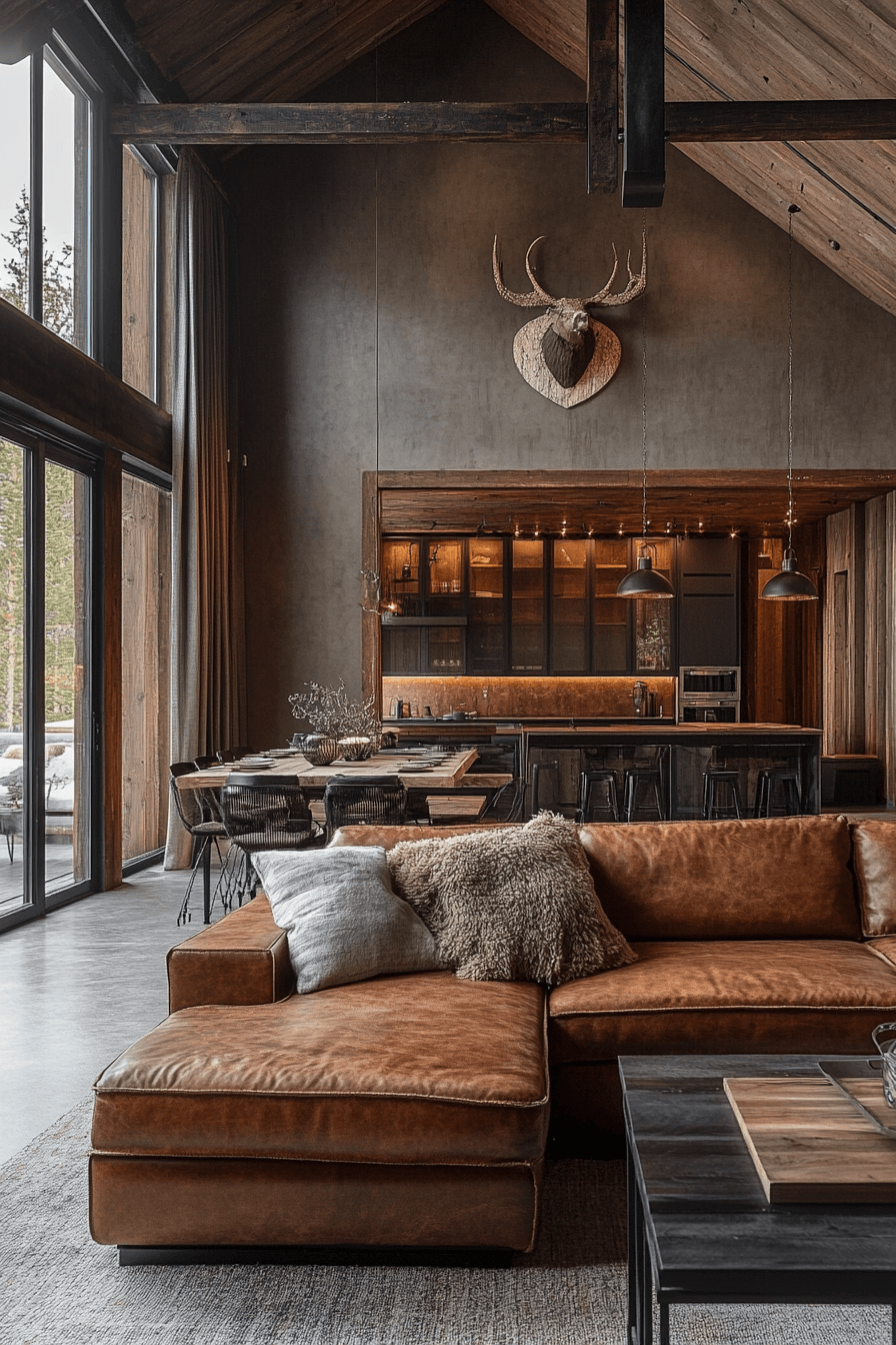 Modern finishes meet rugged textures in cabin interiors that feel adventurous yet refined. The contrast adds personality and depth. Comfortable seating ensures a welcoming feel. The design remains stylish and current. The space feels bold yet balanced. Discover this chic wilderness look for your cabin interiors.