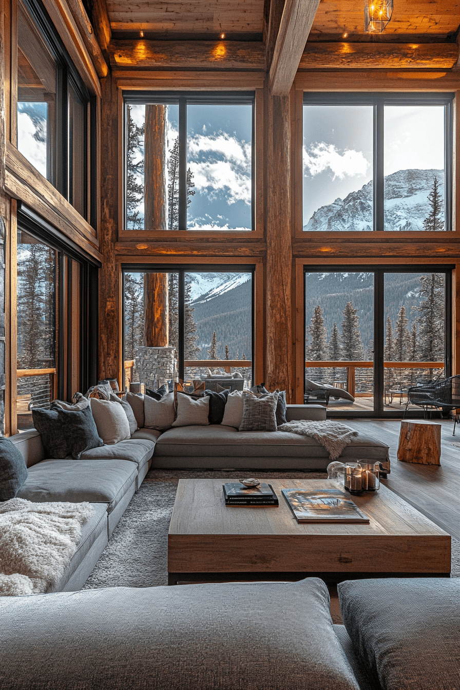 Floor-to-ceiling windows transform cabin interiors into light-filled retreats that feel connected to the outdoors. Clean lines and modern furnishings keep the layout simple and uncluttered. Natural scenery becomes part of the decor, creating a seamless visual flow. The contrast between sleek interiors and rugged surroundings feels striking and fresh. Every detail enhances both comfort and style. Refresh your cabin interiors with this modern mountain approach.