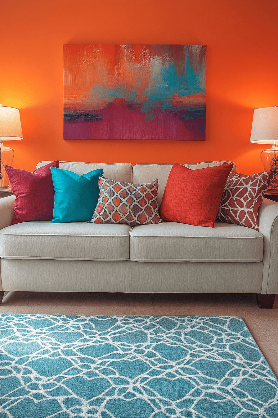 Orange accents bring warmth to colorful living room ideas with bold, lively energy that feels welcoming. This vibrant shade adds personality instantly. Pairing with softer tones keeps balance. Contrasts enhance visual appeal. The room feels dynamic yet comfortable. Refresh your space with bold orange details.