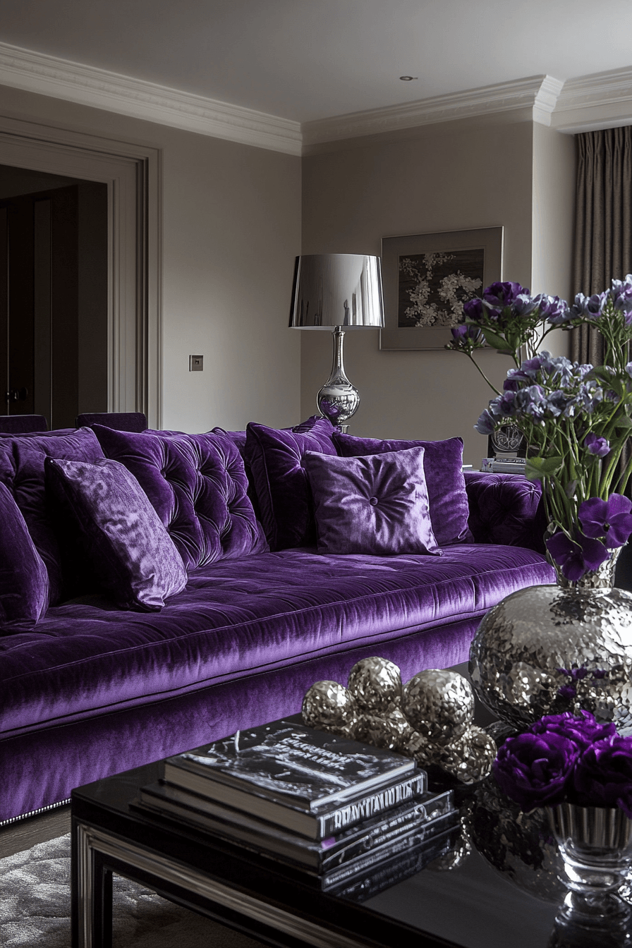 Purple hues enrich colorful living room ideas with dramatic depth and cozy elegance. Dark shades add sophistication while lighter tones soften the look. Metallic accents enhance richness. The space feels refined and inviting. Color creates a strong yet balanced statement. Add purple tones for elevated style.