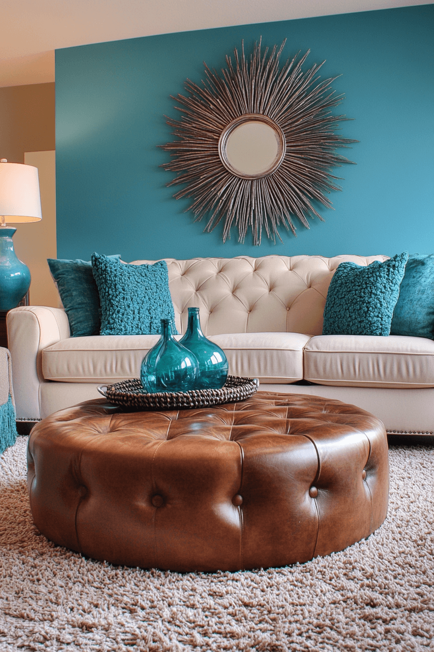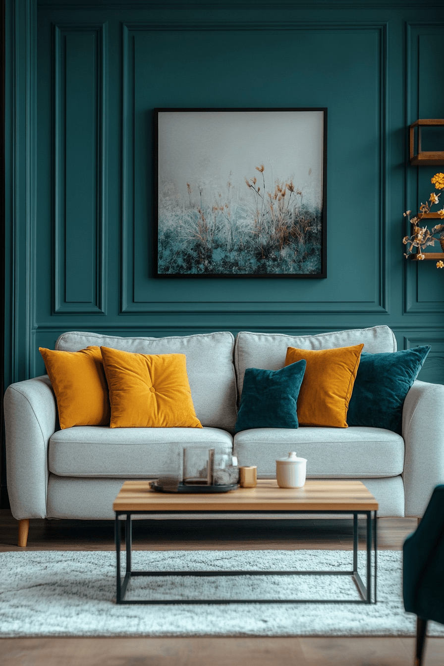 Teal tones define colorful living room ideas with calm sophistication and rich depth. This color blends beautifully with warm neutrals. Metallic accents enhance the design. The space feels elegant and cozy. Balance comes naturally. Create a refined teal-inspired living room.