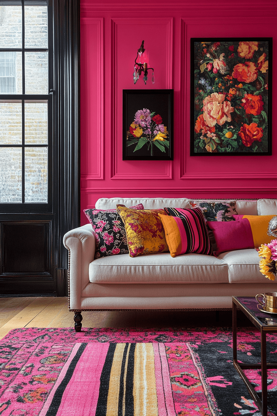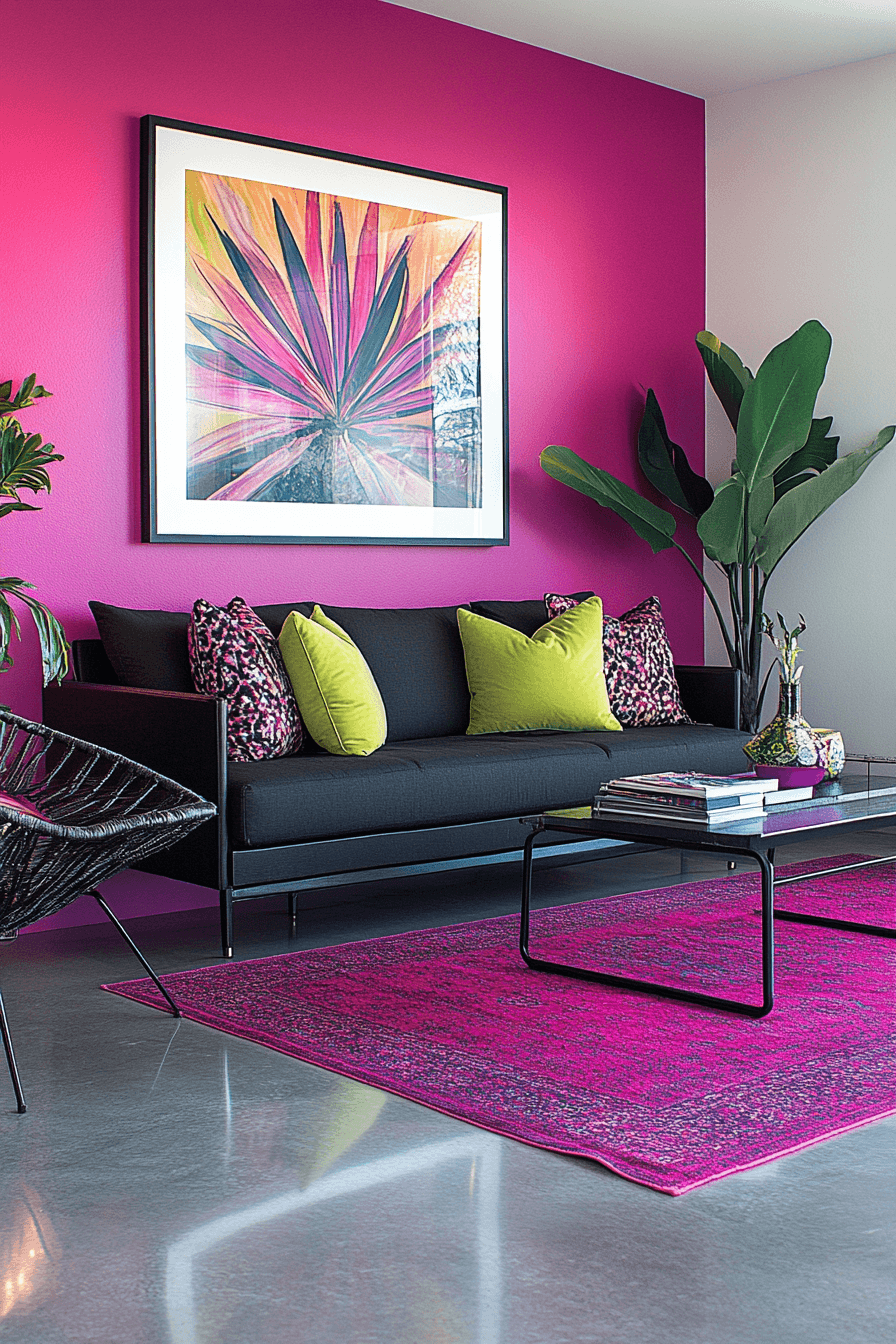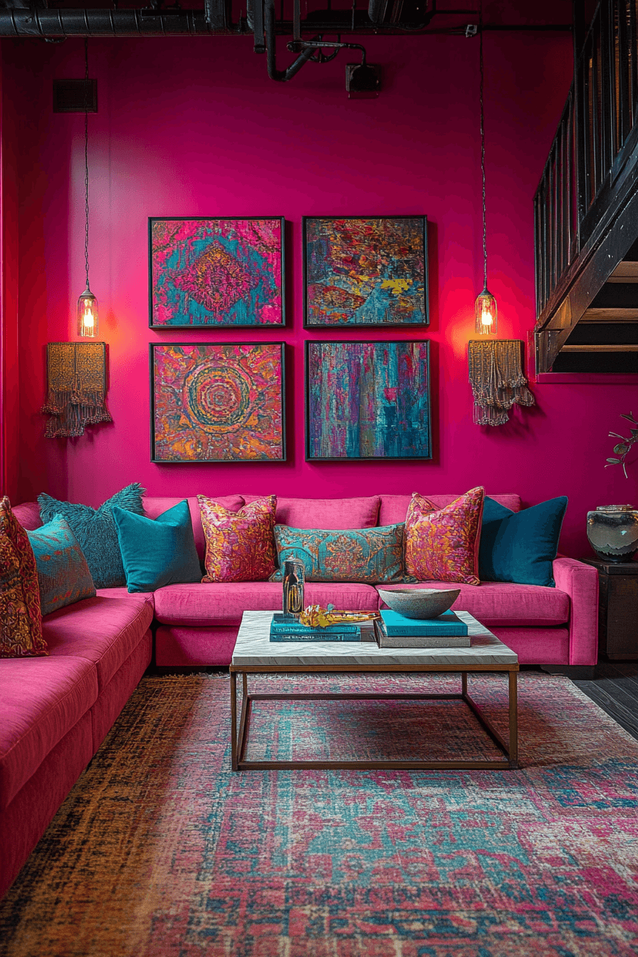 Hot pink energizes colorful living room ideas with bold personality and fearless style. This vibrant shade transforms the space instantly. Dark accents add contrast. The palette feels modern and expressive. The design stands out effortlessly. Make your living room pop with hot pink.