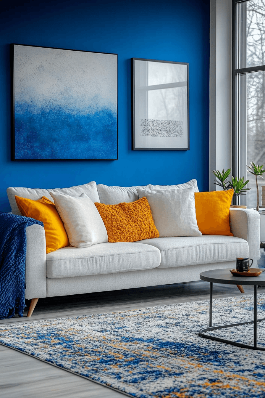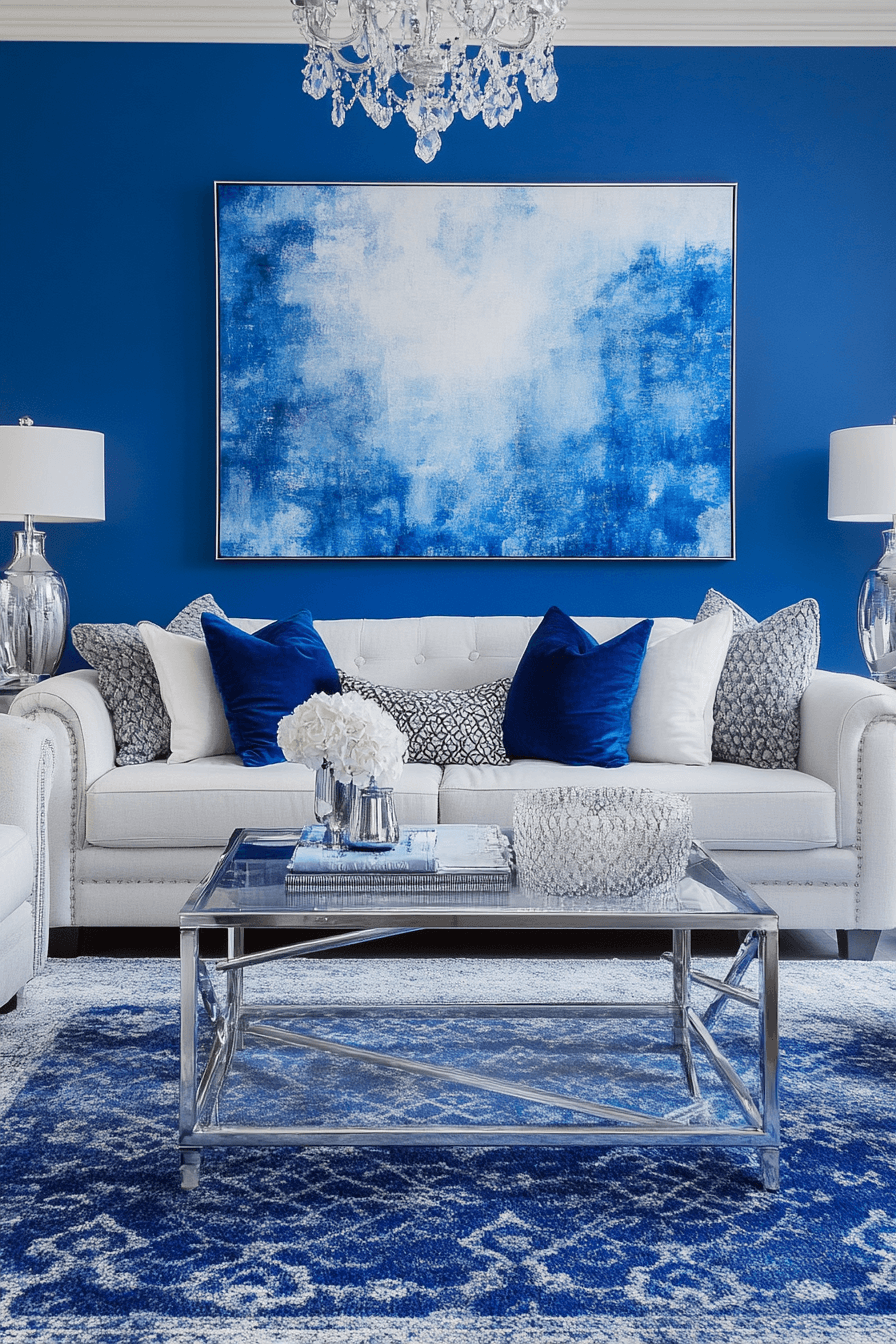 Cobalt tones define colorful living room ideas with bold elegance and striking contrast that feels sophisticated. This deep shade draws attention easily. Neutral accents keep balance. Reflective finishes add modern flair. The space feels upscale and vibrant. Make a bold statement with cobalt.