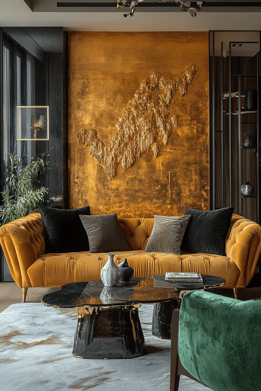 Golden accents enhance colorful living room ideas with warmth and a touch of luxury that feels inviting. Metallic tones reflect light beautifully. Rich textures add depth. The space feels elegant and cozy. The design feels elevated yet approachable. Add gold details for a refined look.