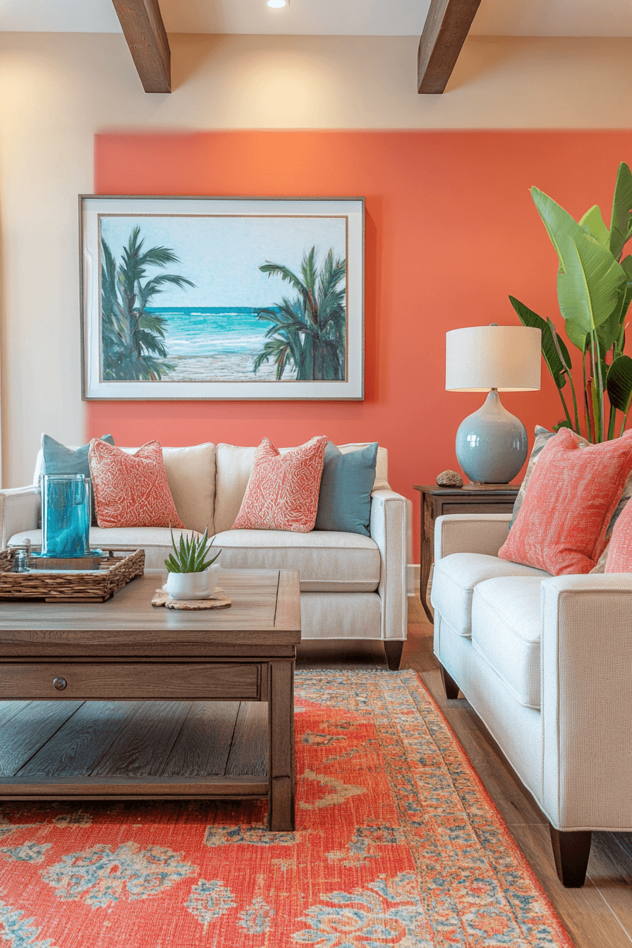 Coral tones brighten colorful living room ideas with cheerful warmth and soft vibrancy. This hue pairs beautifully with light neutrals. Deeper accents add contrast. The space feels fresh and welcoming. The palette feels relaxed yet lively. Add coral for a sunny touch.