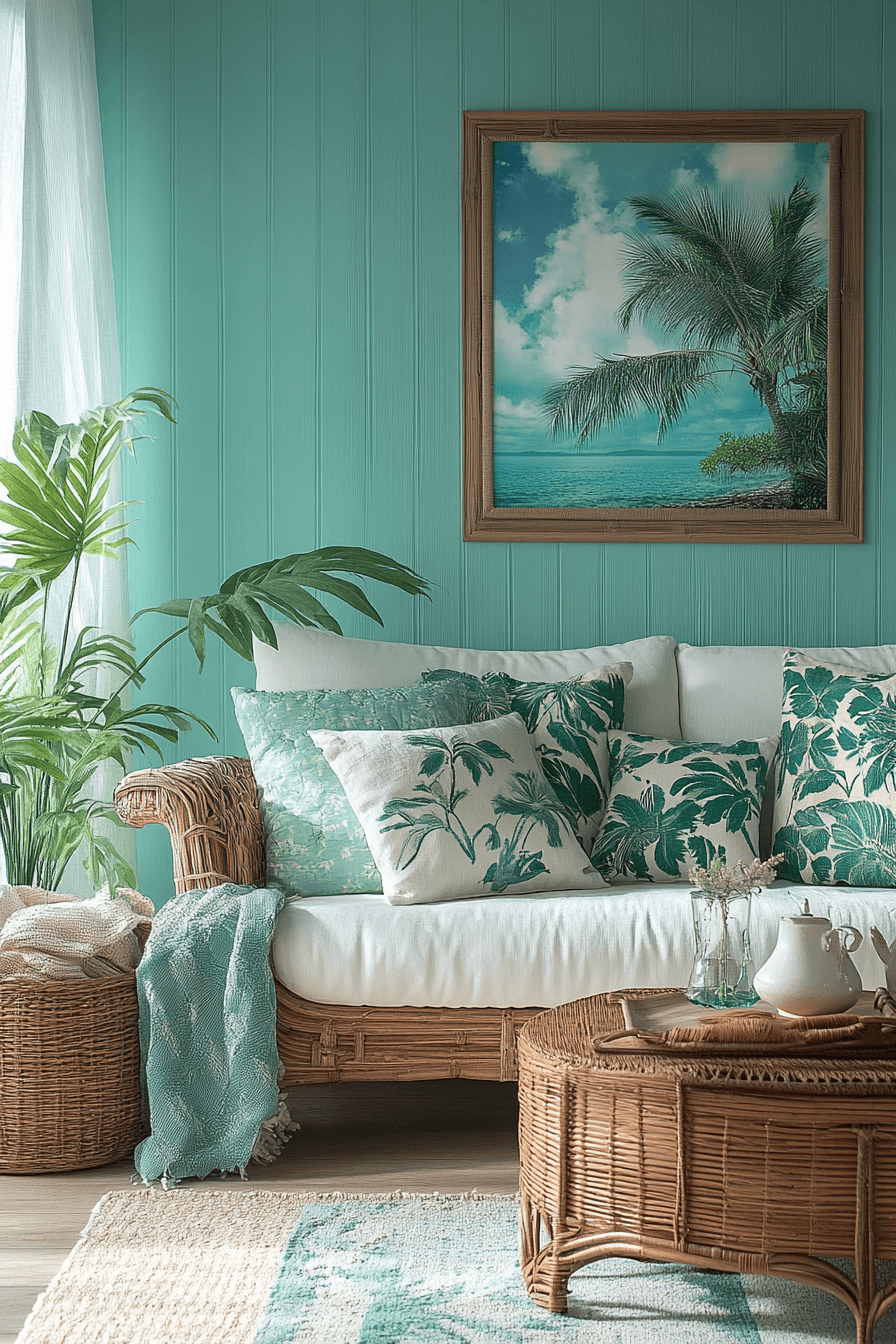 Aqua tones bring breezy energy into colorful living room ideas with a fresh, tropical feel. This shade works well with crisp whites. Patterns add movement. Soft fabrics keep the space cozy. The atmosphere feels light and uplifting. Create a tropical-inspired living room.