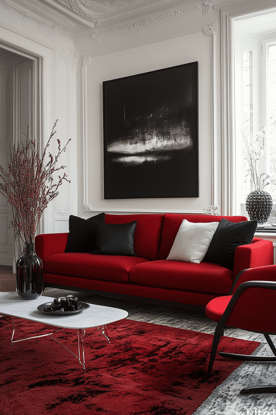 Red and white combinations shape colorful living room ideas into bold yet clean designs with striking contrast. Red energizes while white opens the space. The pairing feels timeless and versatile. Accents add movement. The room feels polished and dynamic. Style your space with classic contrast.
