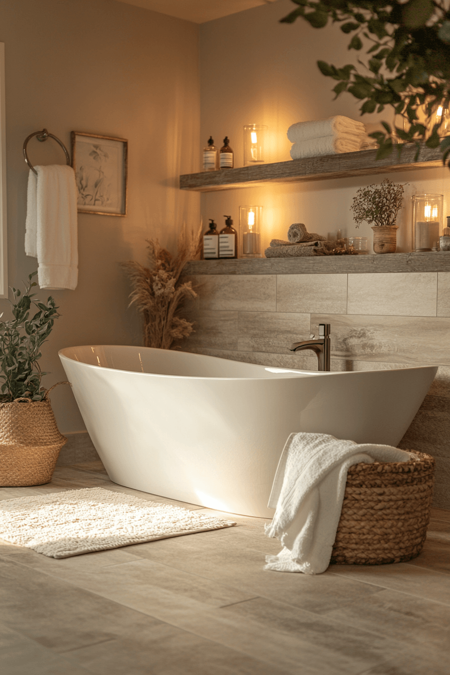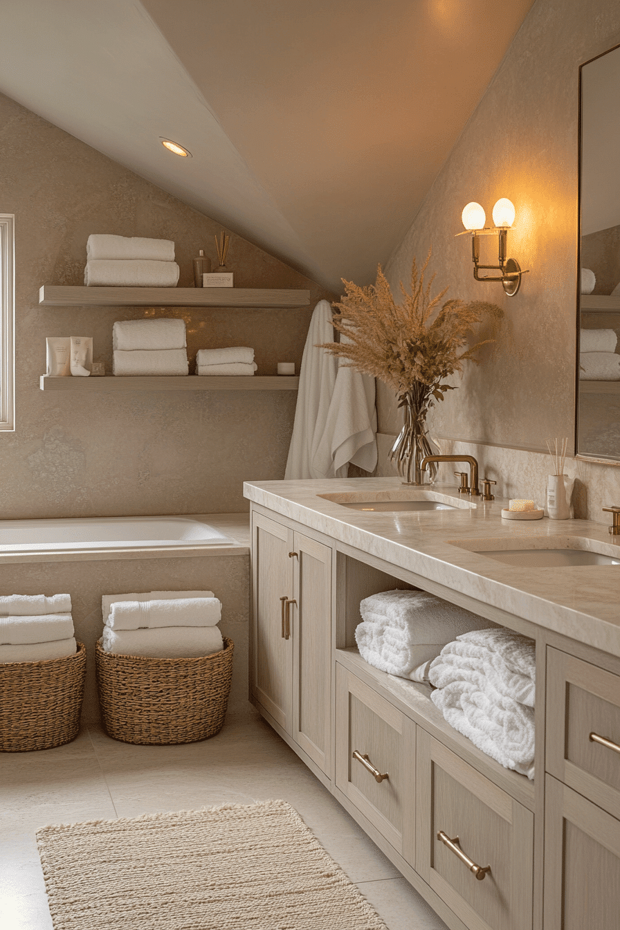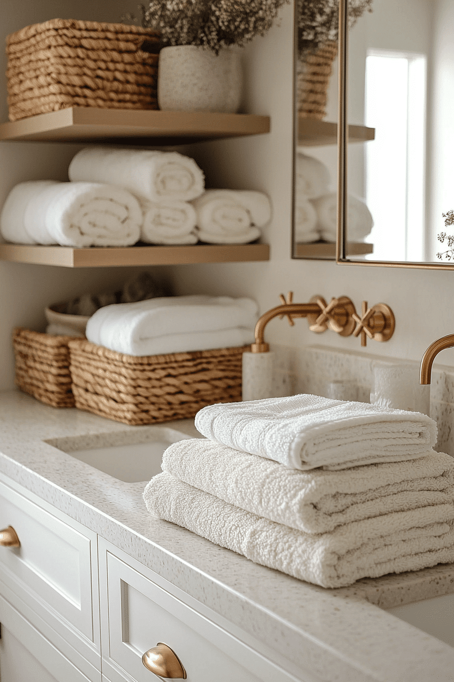 Simple styling choices can completely elevate a cozy bathroom without major changes. Thick, oversized towels instantly add both texture and warmth to the space. Arranging them on open shelves or in baskets creates a layered, inviting look. Combined with warm lighting, the room feels polished and comfortable. It’s a small detail that makes a noticeable impact. Try this easy upgrade for a cozier feel.