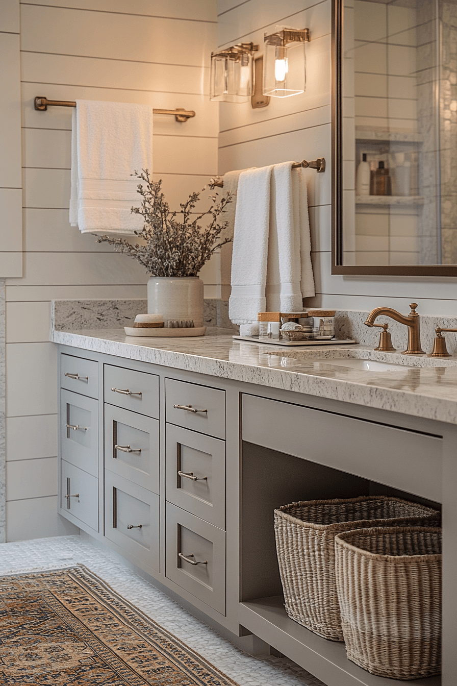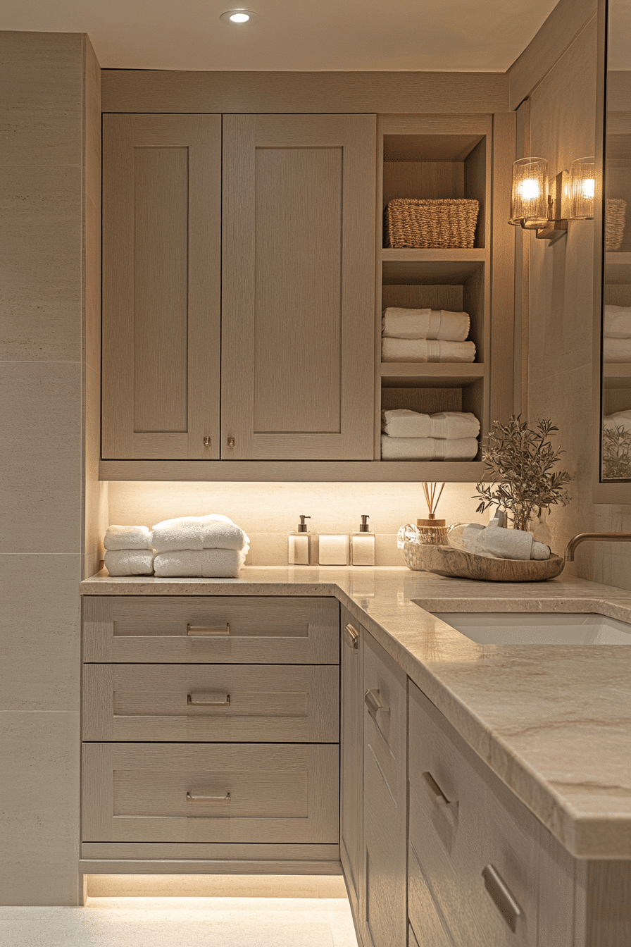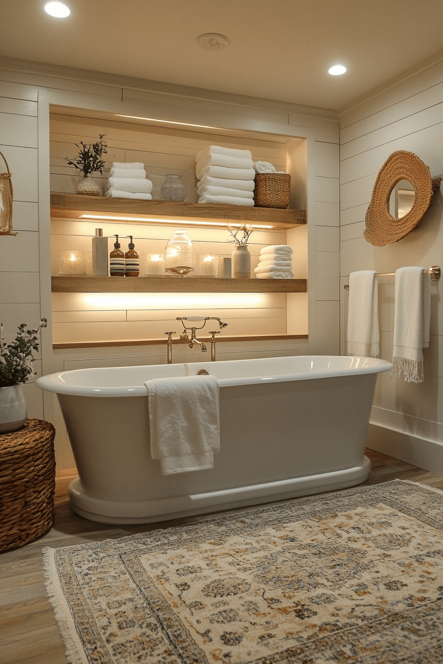 Simple styling choices can completely elevate a cozy bathroom without major changes. Thick, oversized towels instantly add both texture and warmth to the space. Arranging them on open shelves or in baskets creates a layered, inviting look. Combined with warm lighting, the room feels polished and comfortable. It’s a small detail that makes a noticeable impact. Try this easy upgrade for a cozier feel.