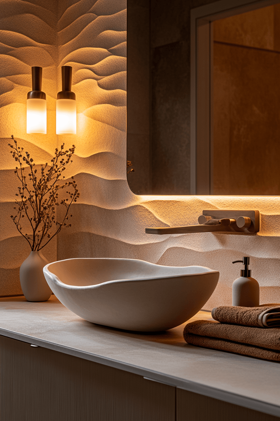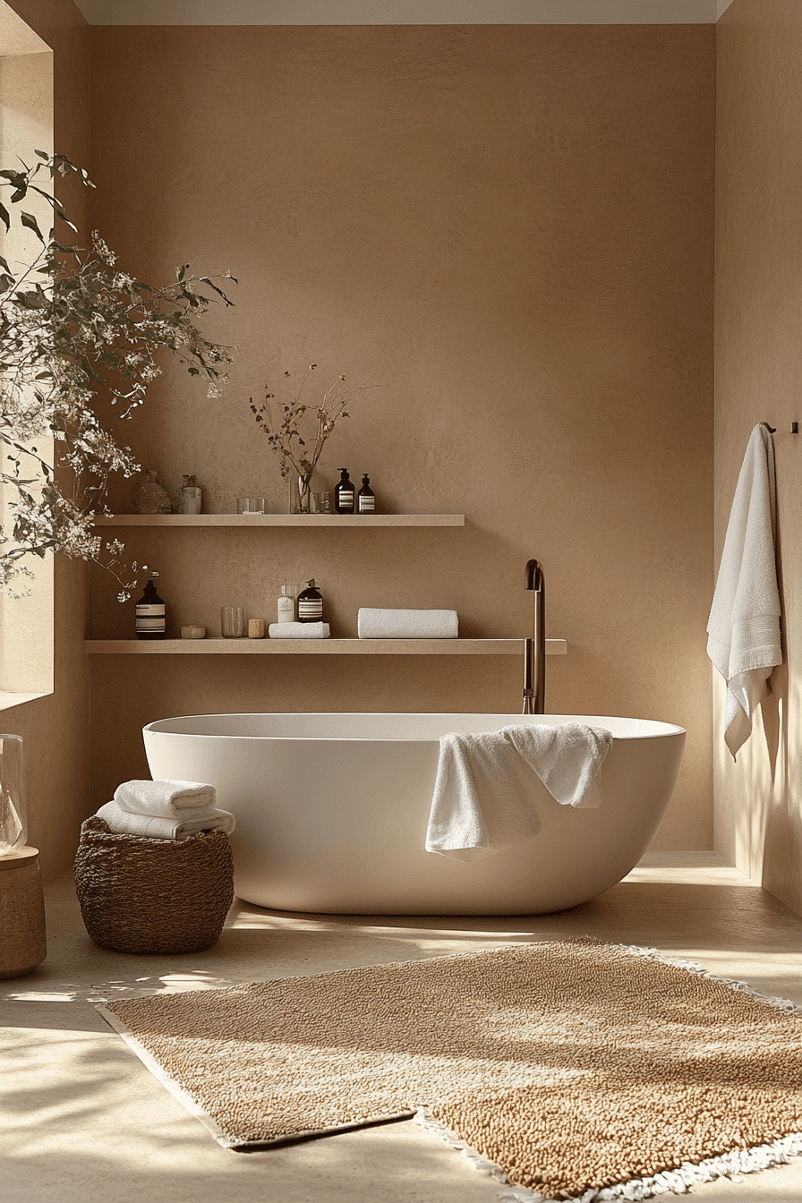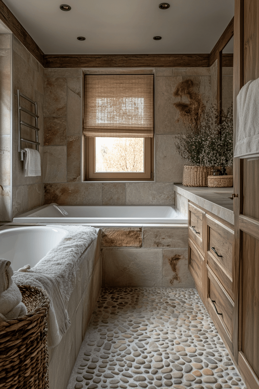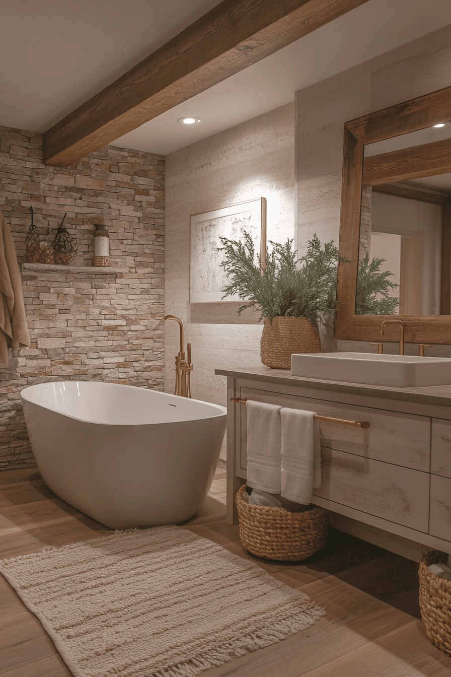 An earthy-inspired cozy bathroom brings a sense of calm through natural materials and tones. Stone, wood, and organic finishes create a layered and grounded look. Each element adds visual depth while keeping the design soft and approachable. Warm lighting highlights these textures beautifully. The result feels peaceful, natural, and deeply relaxing. Bring this nature-inspired look into your home.