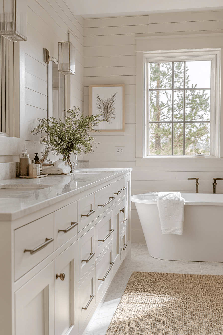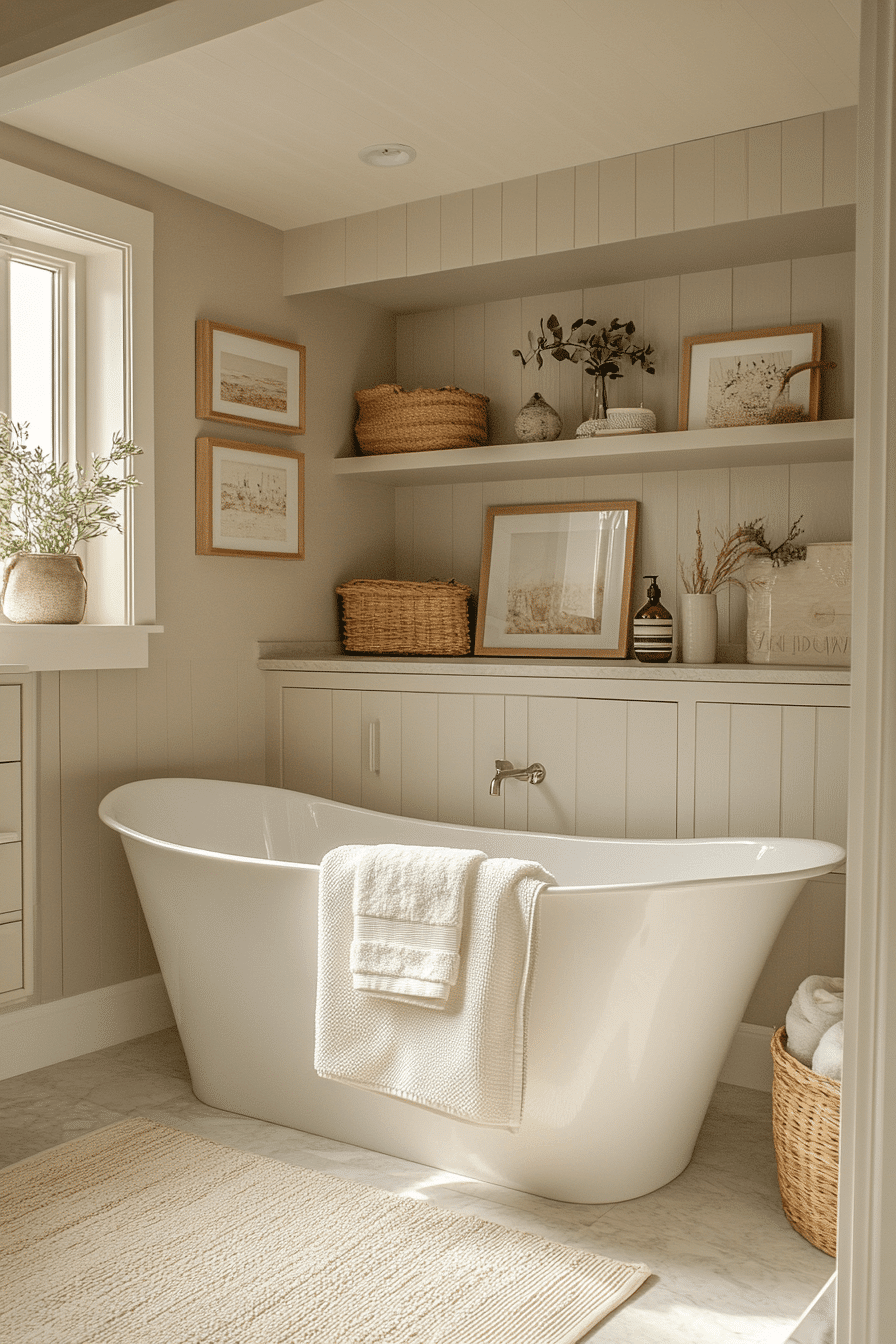 Light, creamy tones can make a cozy bathroom feel open yet comforting. Soft whites and warm beiges layer together beautifully. Subtle metallic finishes add a gentle shine without overpowering the design. Rounded shapes and plush textiles soften the look. The result feels calm, bright, and welcoming. Bring this airy warmth into your space.