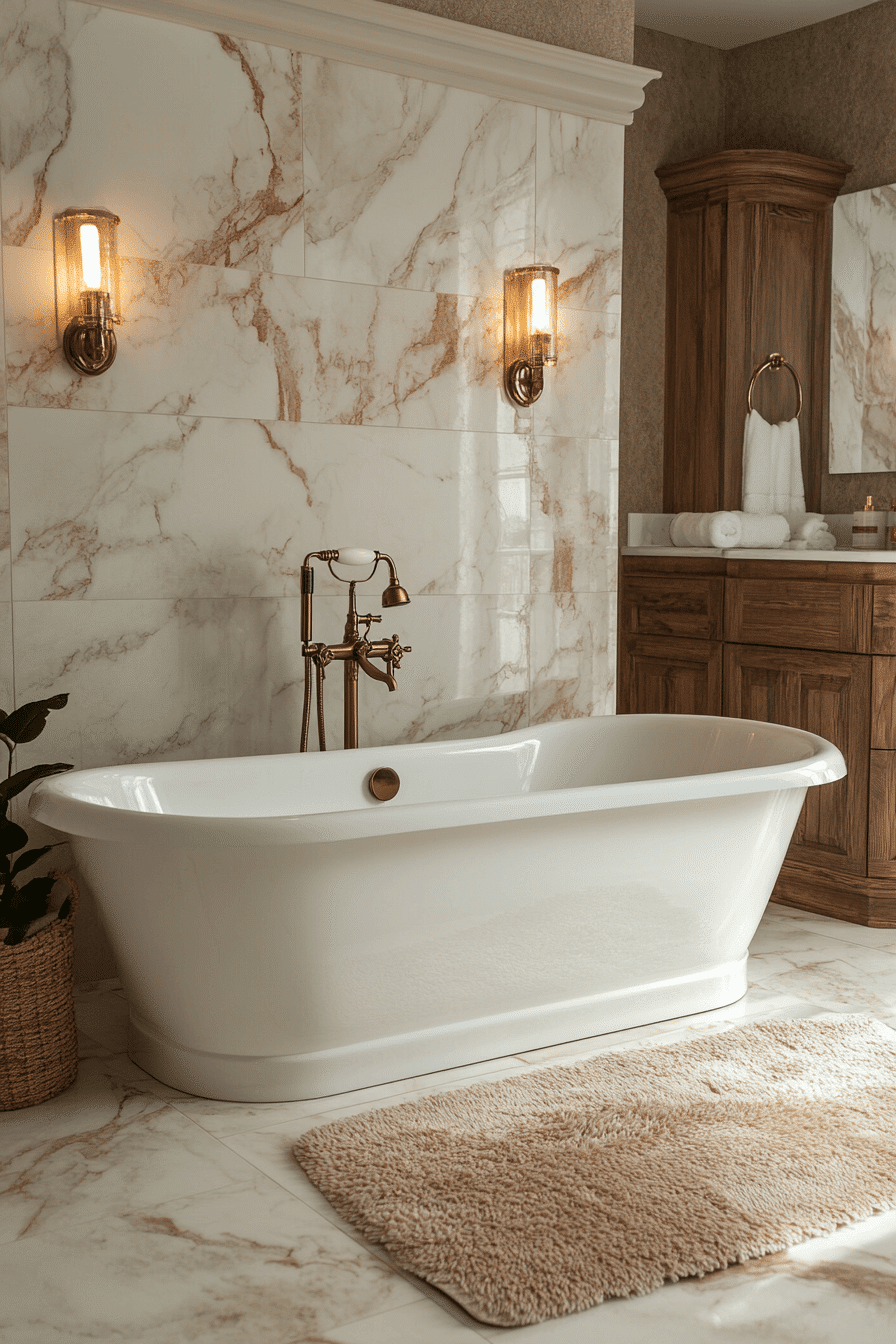 Marble doesn’t have to feel cold when used in a cozy bathroom setting. Warmer tones and soft textures balance the stone perfectly. Wood and brass details add depth and warmth. The combination creates a refined yet inviting atmosphere. Every element works together to soften the space. Style marble in a way that feels warm and welcoming.